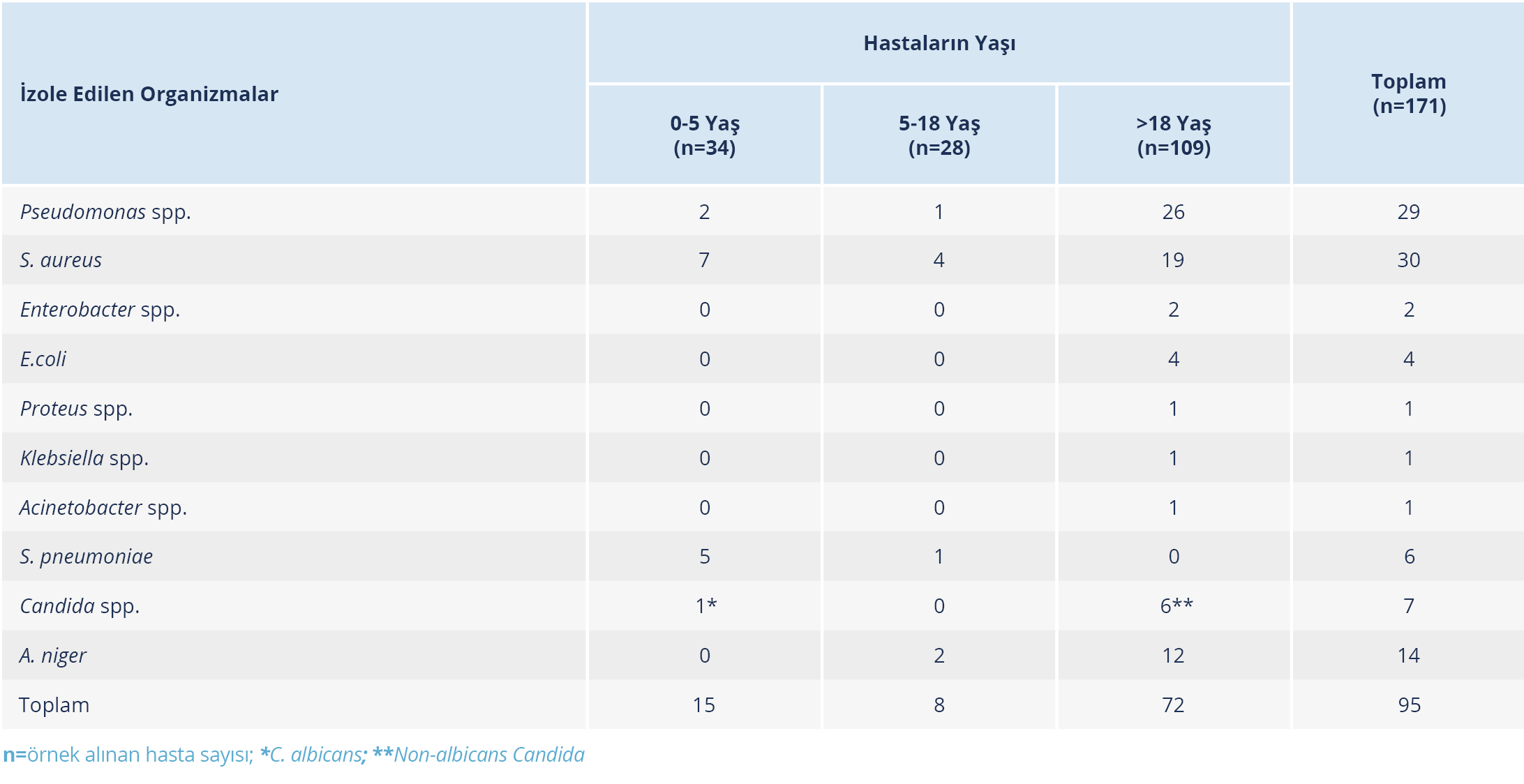 Pseudomonas spp. üremesi olan hastaların ortalama yaşı 41.5 (± 23.04) yıl ve S. aureus üremesi olan hastaların ortalama yaşı 23.1 (±18.73) yıl olarak bulundu. Küf üremesi gözlenen hastaların ortalama yaşı 41.2 (± 25.11) yıl idi.