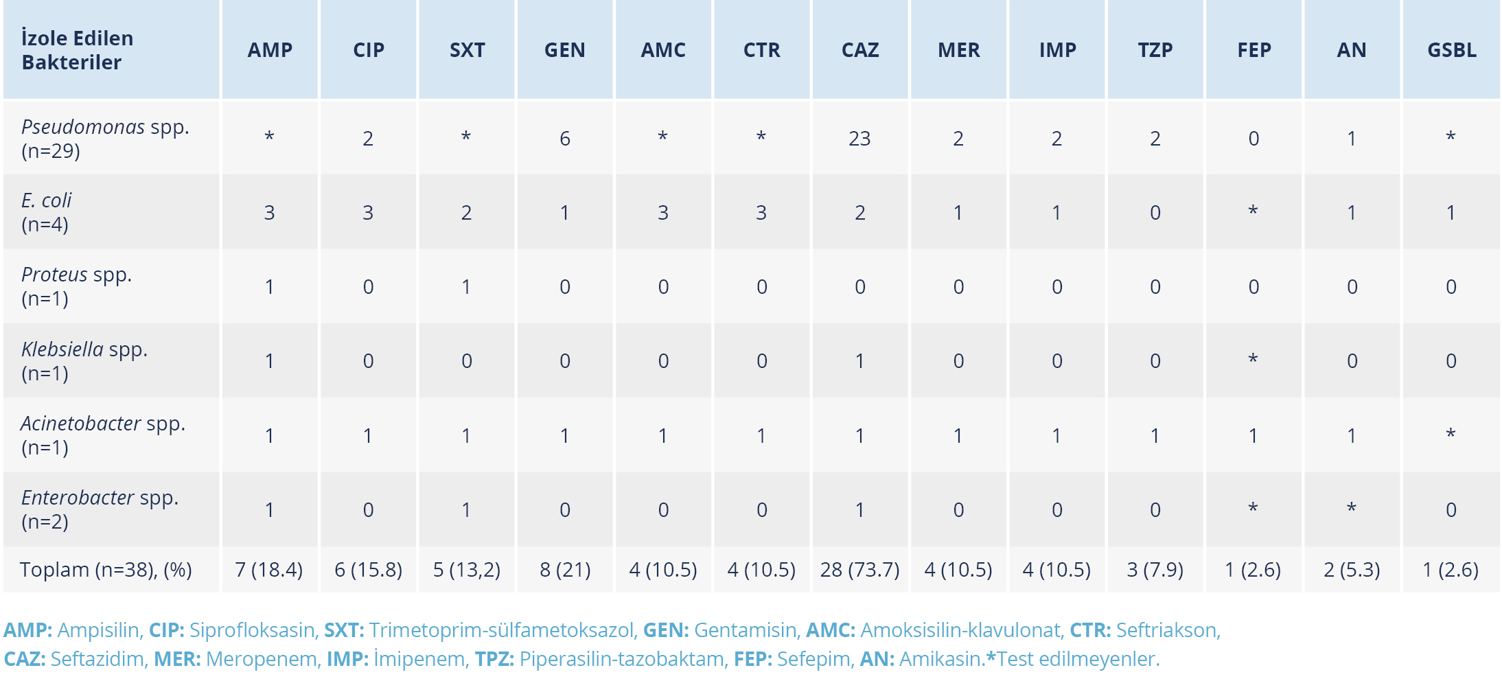 İzole edilen Gram-negatif bakterilerin %77.7’sinin ampisiline direnci olduğu tespit edildi. Siprofloksasine karşı en en fazla direnç %75 oranı ile E. coli’de görüldü. İzole edilen Pseudomonas spp. izolatları için sadece iki hastada siprofloksasine direnç tespit edildi. Proteus spp., Klebsiella spp. ve Acinetobacter spp. ampisiline %100 direnç göstermişti. Gram-negatif bakteriler için sadece bir hastada geniş spektrumlu beta-laktamaz (GSBL) direnci tespit edildi. Acinetobacter spp. üreyen izolat test edilen tüm antimikrobiyallere direnç göstermişti. Patojenlerin % 22.2’si gentamisin direnci göstermiş olup Acinetobacter spp. %100, E. coli %25 ve Pseudomonas spp. %16.6 oranında direnç göstermişti (Tablo 4).