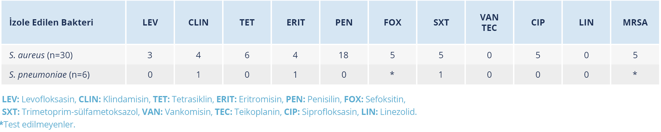 İzole edilen S. pneumoniae izolatlarının tamamı penisiline duyarlı bulundu. S. aureus izolatlarının; penisiline %60, tetrasikline %20 ve trimetoprim-sülfametoksazola %16.6 oranlarında direnç gösterdiği tespit edildi. Ancak, S. aureus’un tüm izolatları vankomisine ve linezolide duyarlıydı. Beş hastada metisiline dirençli S. aureus (MRSA) saptandı. İzole edilen toplam 30 S. aureus izolatından 4 (%13.3)’ü indüklenebilir klindamisin direncine sahipti (Tablo 5).