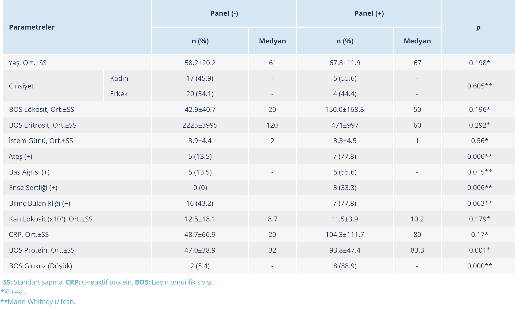 Test panelinde pozitiflik (+) ve negatiflik (-) tespit edilen hastalar istatistiksel açıdan değerlendirildiğinde yaş ve cinsiyet dağılımları açısından anlamlı düzeyde bir farklılık tespit edilmedi (p>0.05). Panel (-) ve panel (+) gruplar; BOS lökosit, eritrosit değeri, bilinç bulanıklığı, kan lökosit sayısı ve CRP değerleri açısından karşılaştırıldığında anlamlı düzeyde (p>0.05) bir farklılık görülmezken panel (+) olan grupta ateş, baş ağrısı, ense sertliği parametreleri panel (-) olan gruptan anlamlı düzeyde (p<0.05) daha yüksek bulundu. Panel (+) saptanan dokuz hastanın yedisinde ateş, beşinde baş ağrısı, üçünde ense sertliği saptanırken ense sertliği panel (-) olan hiçbir hastada saptanmadı. Ayrıca panel (+) olan grupta BOS protein yüksekliği ve BOS glukoz düşüklüğü panel (-) olan gruba göre istatistiksel olarak anlamlı düzeyde idi (p<0.05). Ayrıca BOS protein normal değeri 45 mg/dl olarak alındığında panel (+) olan dokuz hastanın tamamında BOS protein değerinin yüksek olduğu görüldü. Panel (-) ve panel (+) olan gruplar arasında yapılan Mann-Whitney U testi ve χ² test (Fisher kesin testi) sonuçları Tablo 2’de verildi. Ayrıca BOS’ta lökosit varlığı, protein pozitifliği ve glukoz düşüklüğü parametrelerinin birlikteliği panel (+) dokuz hastanın yedisinde saptanırken, panel (-) 37 hastanın hiçbirinde yoktu (p<0.001).