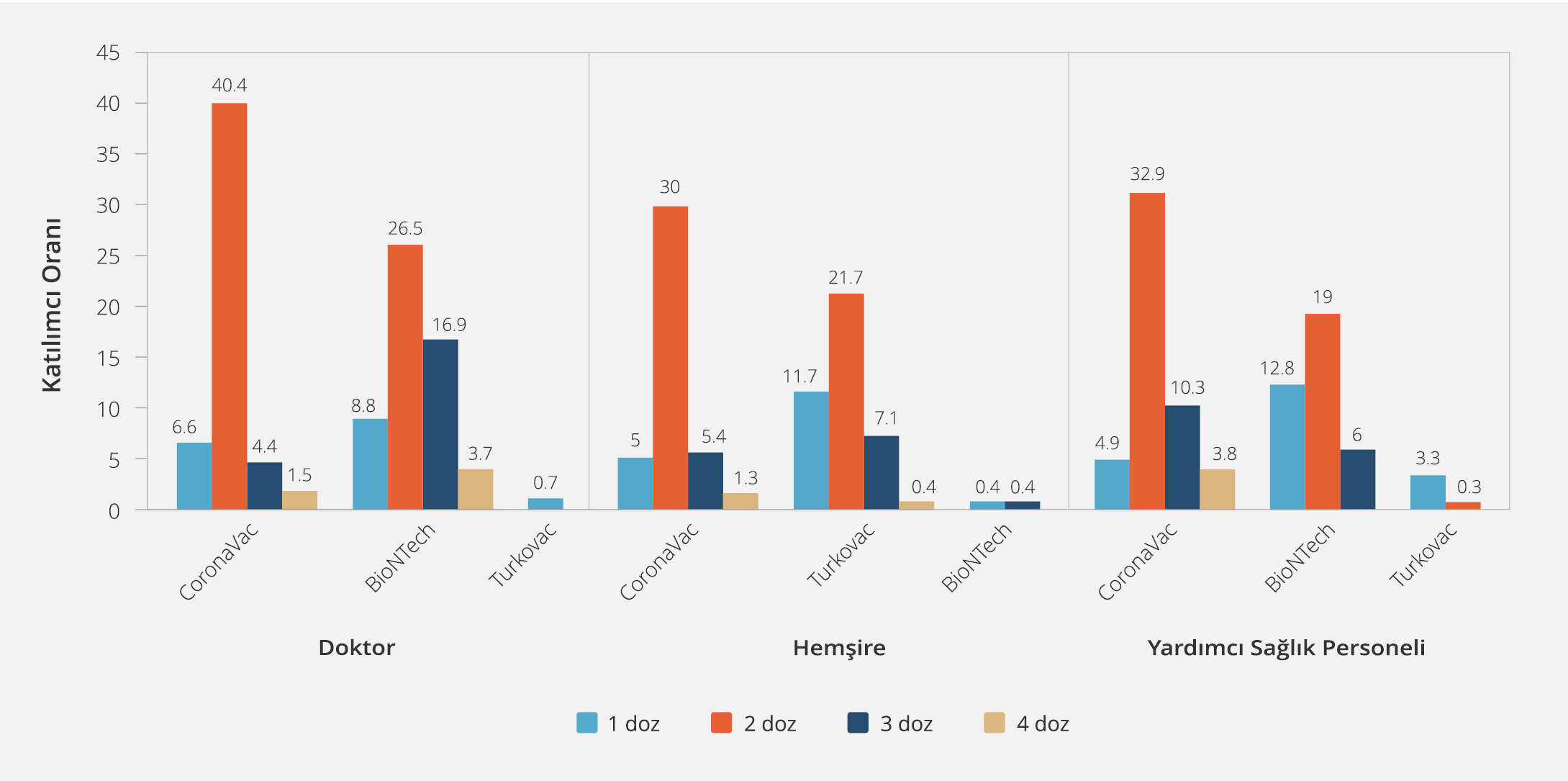 Çalışmamızda, COVID-19 aşısı yaptırmış katılımcılar incelenmiş olup doktorların hemşireler ve yardımcı sağlık personeline göre istatistiksel olarak anlamlı düzeyde daha fazla aşılandığı tespit edildi. Literatürdeki birçok çalışma da bu sonucu destekler bir şekilde doktorların hemşireler ve diğer sağlık çalışanlarına göre aşılanmaya daha meyilli olduğunu göstermektedir (9,12,21,24,25).