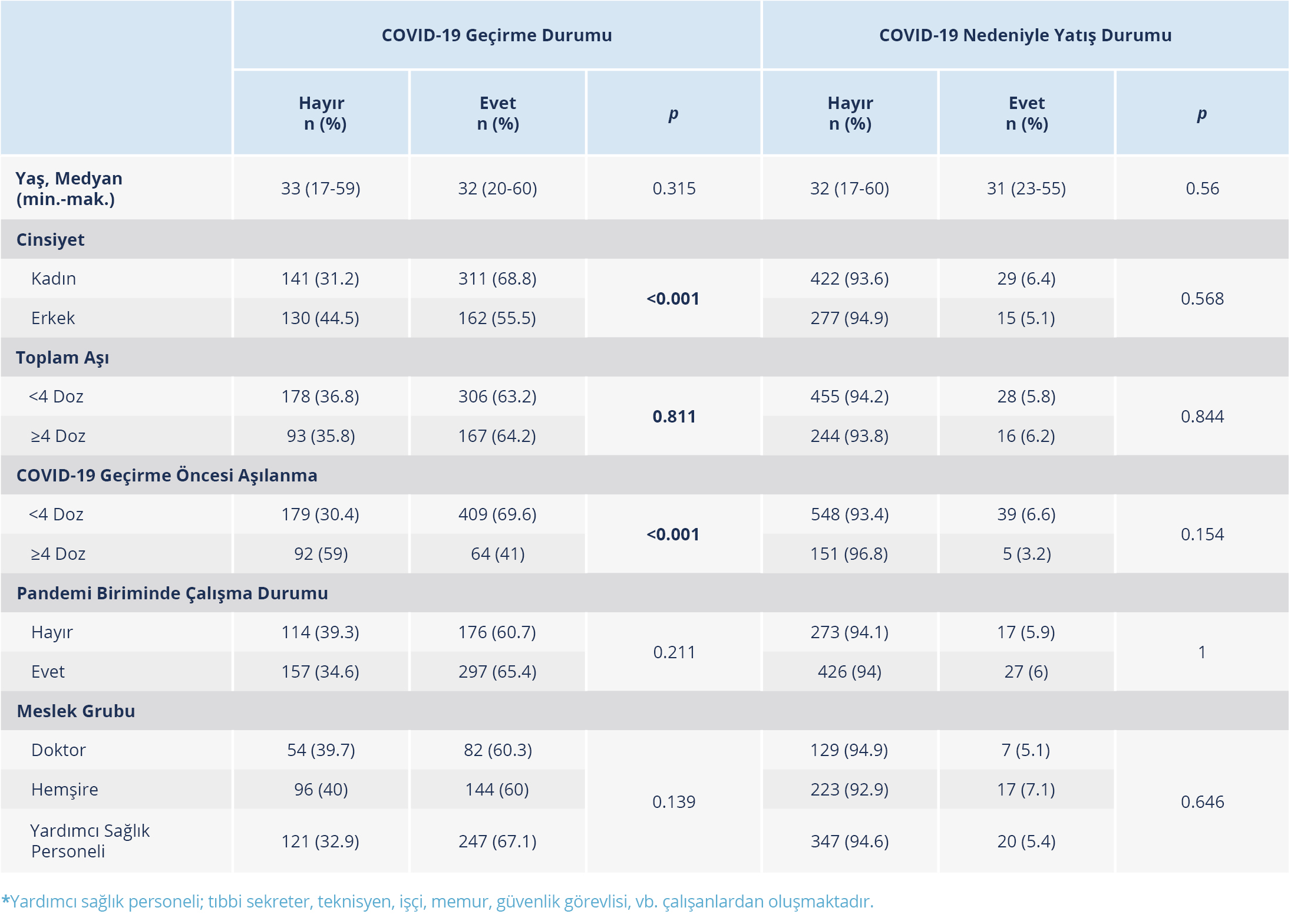 COVID-19 geçiren katılımcılar değerlendirildiğinde; hastalığı geçirme oranının kadınlarda erkeklere göre ve hastalık öncesi aşısız veya eksik doz aşılı olanlarda tam doz aşılı olanlara göre fazla olduğu tespit edildi (sırasıyla p<0.001, p<0.001). Yaş, pandemi biriminde çalışma durumu ve meslek grubu ile COVID-19 geçirme veya COVID-19 nedeniyle hastane yatışı arasında ise istatistiksel olarak anlamlı düzeyde ilişki tespit edilemedi (Tablo 4).