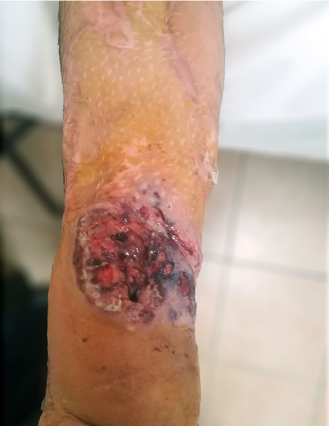 El Cerrahisi Bölümü tarafından greft infeksiyonu ön tanısı ile bilinen ek hastalığı olmayan 35 yaşında erkek hasta için bölümümüzden görüş istendi. Öyküsünden; 10 ay önce düşme sonrası oluşan kesi nedeniyle ön kola dikiş atıldığı, dikişten dört gün sonra yara yerinde hızla ilerleyen ülsere lezyonlar geliştiği ve NF ön tanısı ile yara yerinin debride edilip meropenem, daptomisin ve klindamisin tedavisinin başlandığı öğrenildi. Hastanın takibinde nefes darlığı gelişmesi nedeniyle yapılan toraks görüntülemesinde; bilateral pulmoner efüzyon, pulmoner ödem ve infeksiyöz değişiklikler saptanmıştı. Yine aynı dönemde, hasta ateşinin devam etmesi ve klinik durumunun kötüleşmesi nedeniyle yoğun bakım ünitesine yatırılmış ve mevcut antibiyotik tedavisine kolistin ve siprofloksasinle devam edilmişti. Takibinde ateşi düşen ve akut faz belirteçlerinde gerileme olan hastanın antibiyotik tedavisinin kesilip, yara yerine flep uygulanmasından sonra şifa ile taburcu edildiği epikriz raporundan öğrenildi. Yukarıda özetlenen klinik tablodan 10 ay sonra El Cerrahisi Bölümü tarafından kozmetik amaçlı olarak yapılan cerrahi greft revizyonu girişiminin ardından beşinci gün kesi yerinde nekroz, pürülan akıntı (Resim 1) ve yüksek ateş gelişmişti.