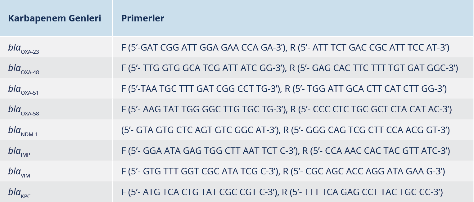 Karbapeneme dirençli bulunan izolatlarda, EURGen-NET protokolüne göre belirlenen, ülkemizde yaygın görülen karbapenamaz genleri (blaOXA-23, blaOXA-48, blaOXA-51, blaOXA-58, blaNDM-1, blaIMP, blaVIM ve blaKPC) RT-PCR yöntemiyle araştırıldı. Araştırılan karbapenemaz genleri için kullanılan primerler Tablo 1’de verildi (10).