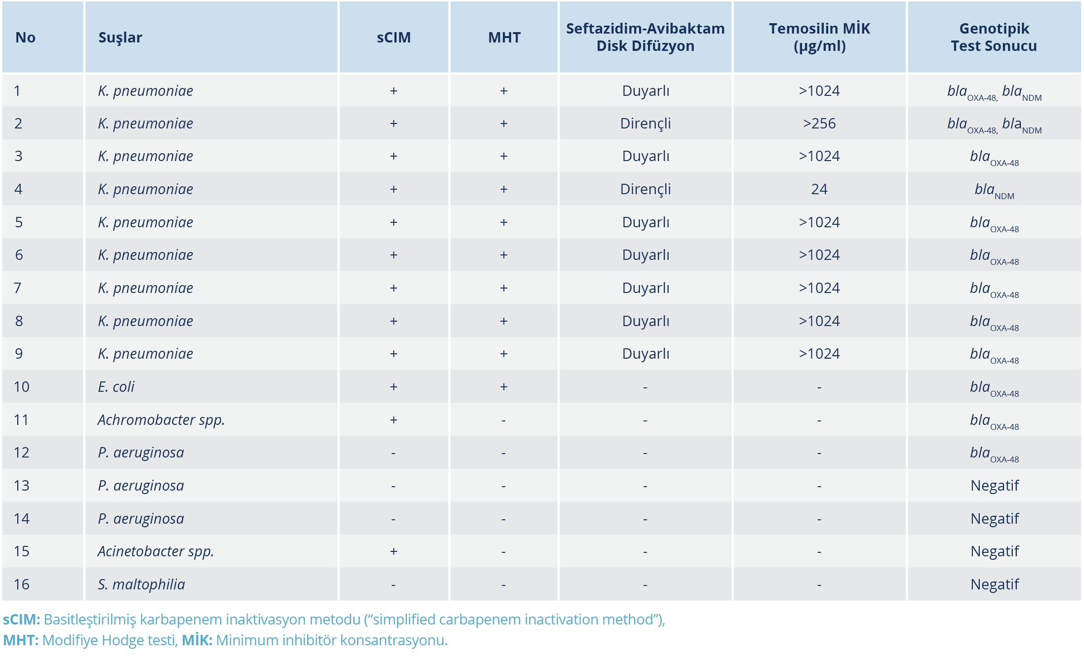 Disk difüzyon yöntemiyle karbapeneme dirençli olduğu belirlenen 16 suşun, 10’u Enterobacterales ailesi üyesi olup (K. pneumoniae, n=9; E. Coli, n=1), üçü P. aeruginosa, bir suş A. baumannii, bir suş S. maltophilia, bir suş Achromobacter spp. idi (Tablo 2). On altı suşun 12’sinde karbapenemaz geni saptandı; 11’inde sCIM, 10’unda MHT pozitif bulundu (duyarlılık sırasıyla %91.9 ve %83.3 idi) (Tablo 3). Karbapenemaz geni saptanan 12 suşun birinde sCIM ile, ikisinde MHT ile karbapenemaz gösterilemedi. Karbapenemaz geni saptanmayan dört suşun ise birinde sCIM pozitif bulunurken hiçbirinde MHT pozitif değildi (Tablo 2).