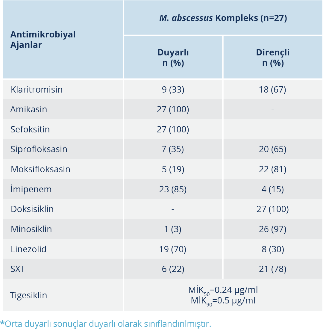M. abscessus kompleks izolatlarına karşı en etkin olan antimikrobiyal ajanlar sırası ile amikasin (%100), sefoksitin (%100), imipenem (%85), linezolid (%70), siprofloksasin (%35), klaritromisin (%33), SXT (%22) ve moksifloksasin (%19) olarak tespit edildi. İzolatların tamamı doksisikline dirençli iken sadece bir M. abscessus izolatı (%3) minosikline duyarlı bulundu. İzolatların ikisi sekiz ilaca, 11’i yedi ilaca ve yedisi altı ilaca dirençli olmak üzere 20 (%74)’si CLSI standardı tarafından test edilmesi önerilen antimikrobiyallerin yarısından fazlasına dirençli bulundu. Tigesiklin için MİK eşik değeri olmadığından MİK50 ve MİK90 değerleri verildi (Tablo 2). İzolatların tigesiklin MİK değerleri 0.12 µg/ml (n=3), 0.24 µg/ml (n=15), 0.5 µg/ml (n=8) ve 1 µg/ml (n=1) olarak tespit edildi.