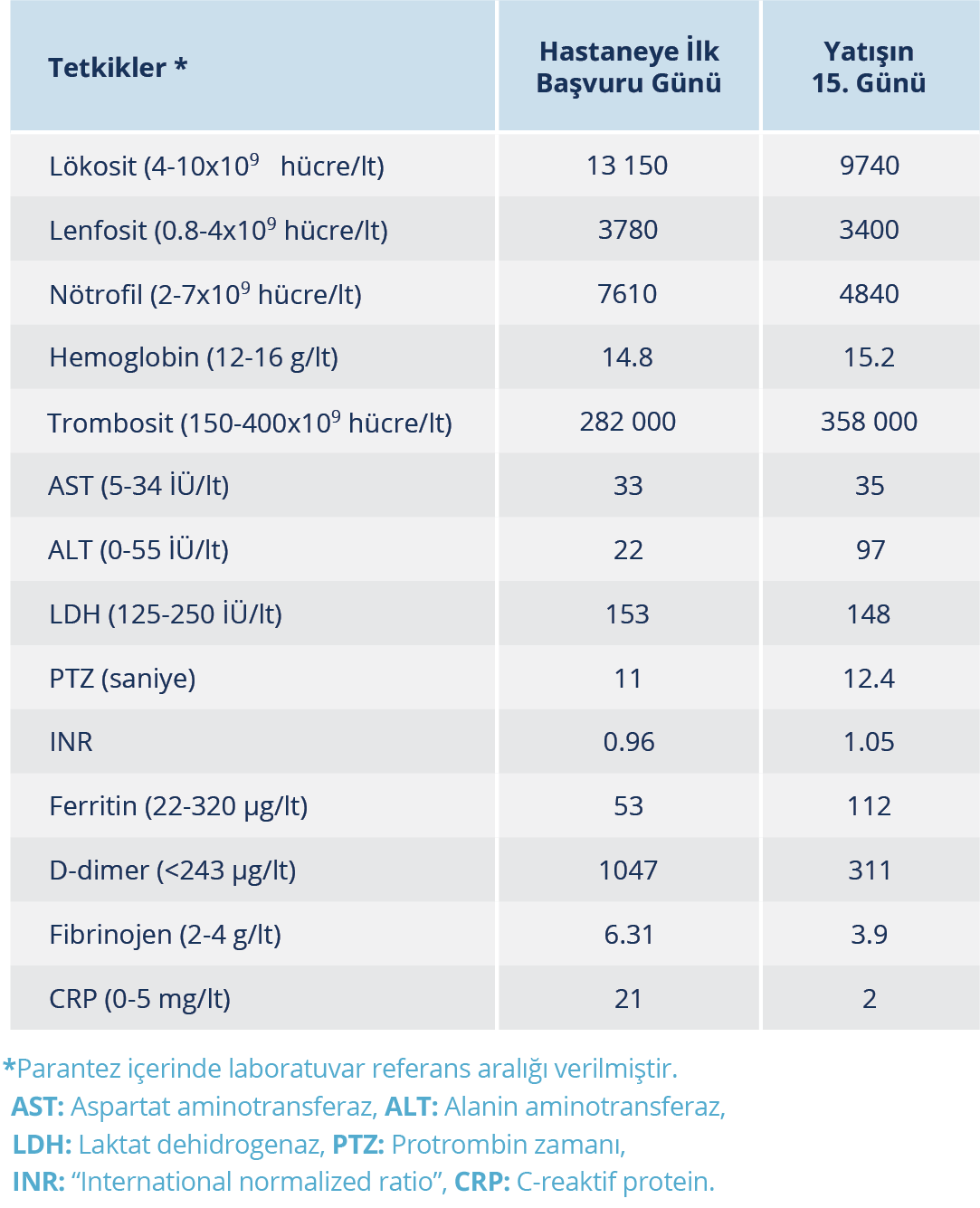 İki SSVT olgusunun sunulduğu bir diğer makalede (bir olguda hipertansiyon ve diyabet olup diğerinde komorbidite yoktu) yazarlar, D-dimer ve C-reaktif protein (CRP) yüksekliğinin ve nötrofil/ lenfosit oranının yüksek bulunmasının kötü prognoz kriteri olduğunu bildirmişlerdir (8). Baldini ve arkadaşlarının (7) meta-analizinde ise olguların %90’ında lenfopeni, %54.5’inde fibrinojen düzeyinde anormallik, iki olgu hariç diğer olgularda CRP ve D-dimer düzeylerinin yüksek olduğu bildirilmiştir. Bizim olgumuzda ise CRP minimal yüksek, D-dimer düzeyi yüksek, lenfosit sayısı ise normal sınırlarda saptandı.
