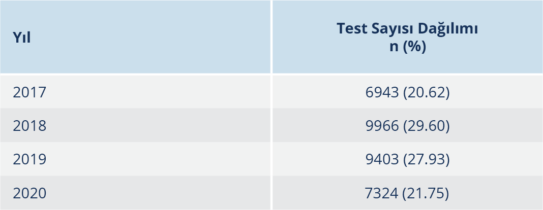Ocak 2017-Aralık 2020 tarihleri arasında toplam 33 636 örnek çalışılmış olup çalışmaya dahil edilen örneklerin yıllara göre dağılımı Tablo 1’de verildi. En çok örnek %29.60 oranı ile 2018 yılında çalışılmıştı. Hastalar 0 ile 90 yaş arasında olup ortalama yaş 29.14±6.6 yıldı ve %98.94’ü 18 yaş üstündeydi. Seropozitif olarak tespit edilen bireylerin yaş ortalamaları 29.45±6.6 (0-78) yıldı. Tüm örnekler içinde en fazla seropozitif olgu 20-29 yaş grubunda (n=4626, %26.72) görüldü. Diğer yandan en yüksek seropozitiflik oranı (%35.07) >50 yaş grubundaydı (Tablo 2).