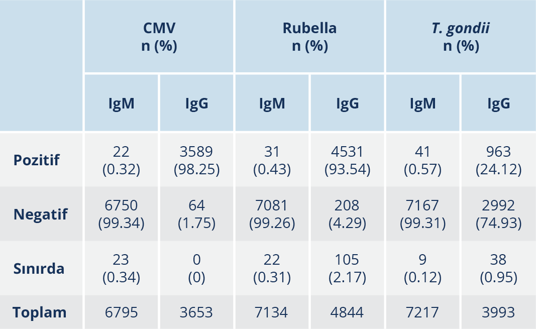 Toplam 6795 hasta örneğinde CMV IgM antikorları çalışılmış olup 22 (%0.32)’sinde sonuç pozitifti; 10 örnekte sadece IgM pozitif olarak saptanmış olup IgG negatif idi. CMV IgG antikoru 3653 hastanın 3589 (%98.25)’unda pozitif bulunmuştu; CMV antikorları pozitif olarak bulunan hastaların yaş ortalaması 29.56±6.6 yıl olarak belirlendi. T. gondii IgM antikorları incelenen 7217 hastanın 41(%0.57)’inde pozitif bulunmuş olup sadece IgM pozitif bulunan 16 hasta olduğu görüldü. T. gondii IgG antikorları incelenen 3993 hastanın 963 (%24.12)’ünde pozitiflik saptanmıştı; IgM ve\veya IgG pozitif olarak saptanan hastaların yaş ortalamaları 31.27±6.6 yıl olarak tespit edildi. Rubella antikorları açısından değerlendirilen hastalarda IgM pozitifliği 7134 hastadan 31 (%0.43)’inde saptanmış olup 11 hastanın sadece IgM pozitif olduğu görüldü. IgG pozitifliği 4844 hastanın 4531 (%93.54)’inde saptanmıştı ve hastaların yaş ortalaması 28.94±6.6 yıl olarak hesaplandı (Tablo 3).