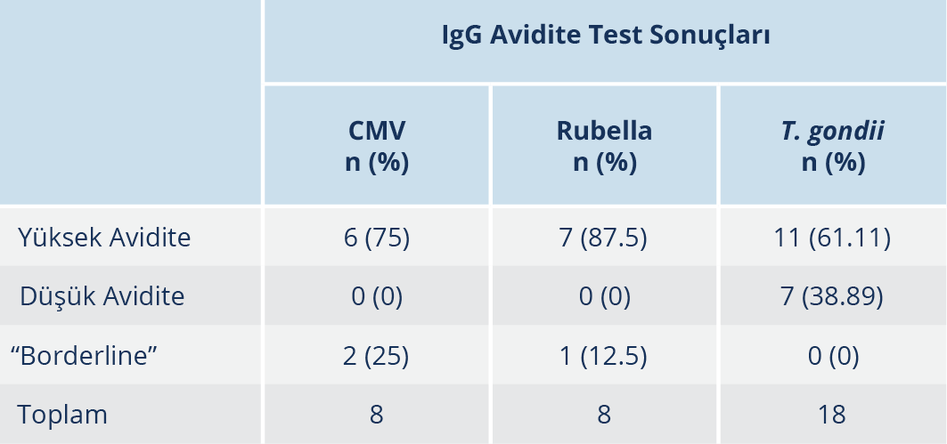 T. gondii, rubella ve CMV için IgM ve IgG açısından seropozitiflik bulunan kadınlarda avidite çalışılmış olanların sonuçları Tablo 5’te verilmiş olup T. gondii IgG avidite çalışılan 18 hastadan 11’inde, CMV IgG avidite çalışılan sekiz hastadan ve rubella IgG avidite testi çalışılan sekiz hastadan yedisinde yüksek avidite tespit edildi.