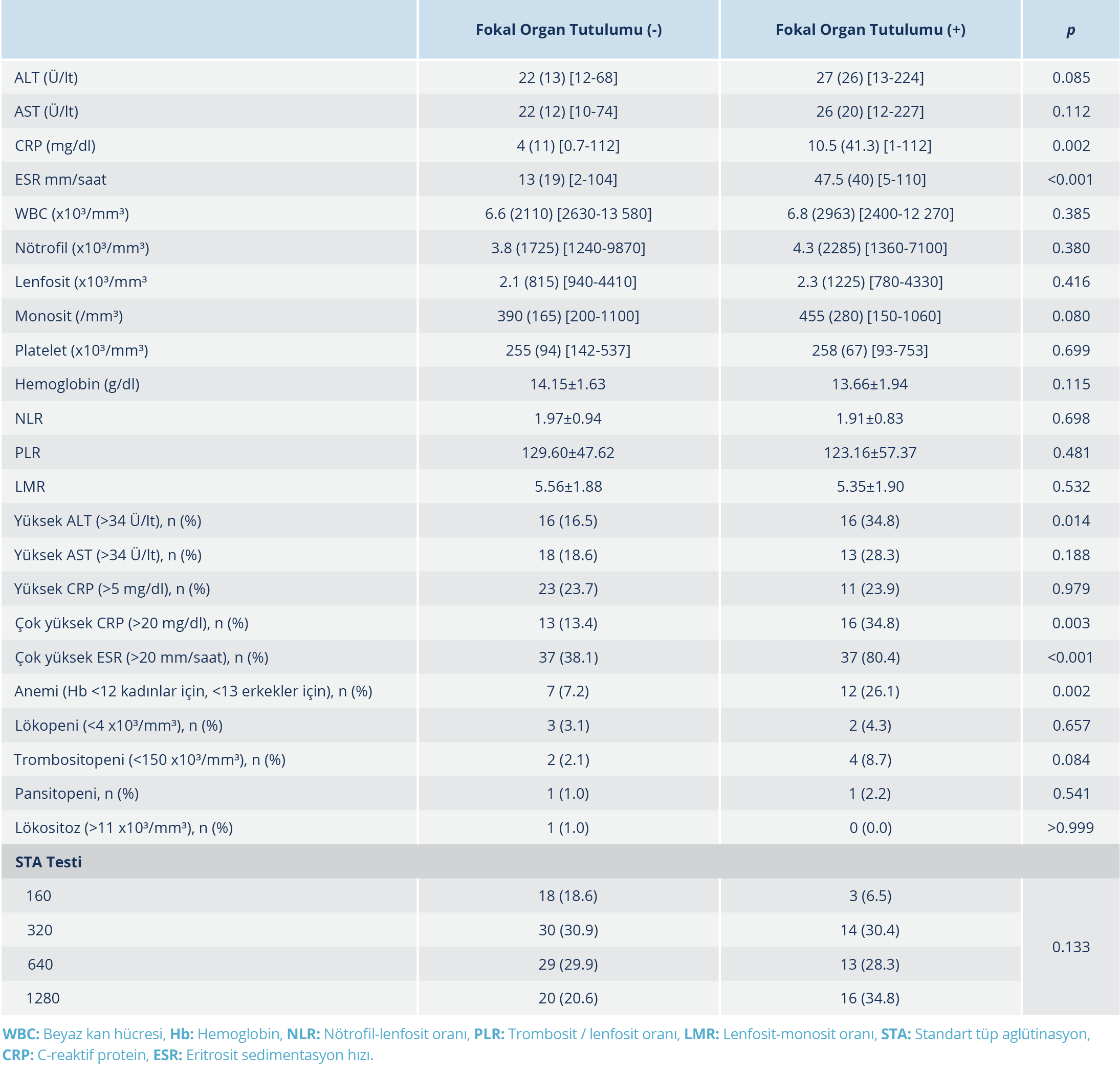 Alanin aminotransferaz, CRP ve ESR medyan değerleri normal aralıkta olmakla birlikte fokal organ tutulumu olan hastalarda daha yüksekti; ALT, CRP ve ESR değerleri arasındaki farklılıklar ise istatistiksel olarak anlamlı düzeyde değildi (ALT için p=0.085, CRP için p=0.002 ve ESR için p<0.001). Bununla birlikte, fokal organ tutulumu olan hastalarda ALT yüksekliği daha yaygın olup ALT (p=0.014), CRP (p=0.003) ve ESR (p<0.001) oranları da anlamlı düzeyde daha yüksekti. Hematolojik parametreler olan trombosit / lenfosit oranı (PLR) (p=0.481), nötrofil / lenfosit oranı (NLR) (p=0.698) ve lenfosit / monosit oranı (LMR) (p=0.532) gruplar arasında benzerdi; anemi varlığı ise fokal organ tutulumu grubunda daha yüksekti (%26.1’e karşı %7.2; p=0.002). Fokal organ tutulumu olan ve olmayan gruplar arasında STA titresi açısından istatistiksel olarak anlamlı düzeyde bir fark yoktu (p=0.133) (Tablo 2).
