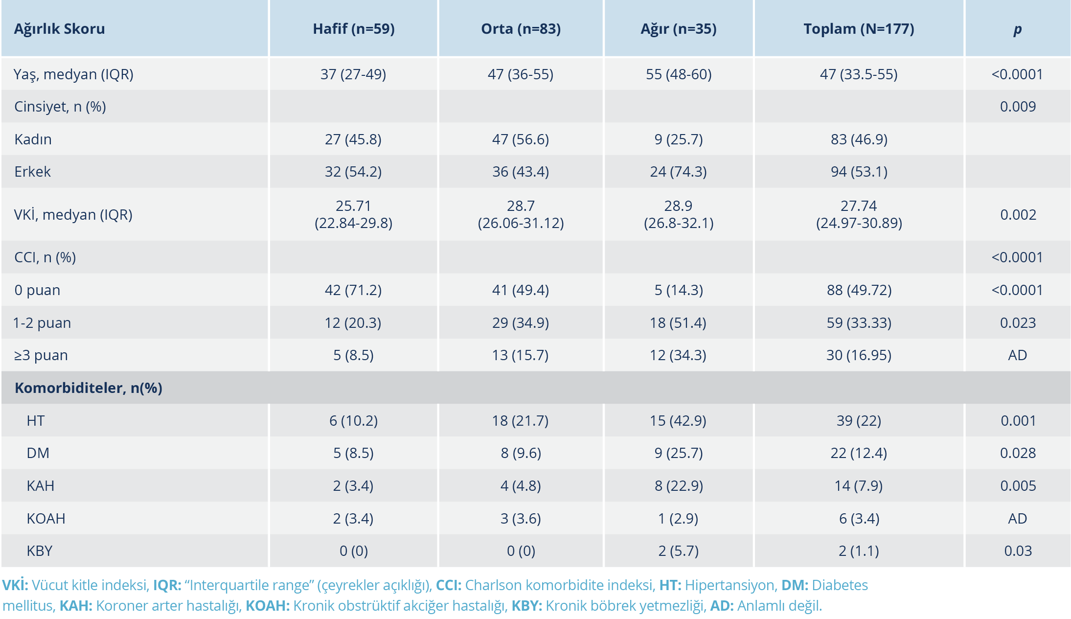 Hastaların demografik özelliklerinin, VKİ ve CCI skorlarının ağırlık skoruna göre dağılımı Tablo 1’de verildi. İkili analizlerde, erkek hastaların kliniği, anlamlı düzeyde daha ağır seyretti (p=0.009). Ağır hastalarda; HT, DM, KAH, KBY daha yüksek oranda saptandı (sırasıyla p=0.001, p=0.028, p=0.005, p=0.03). Klinik ağırlık skoru yüksek olan hastalarda yaş, VKİ ve CCI değeri anlamlı düzeyde daha fazlaydı (sırasıyla p<0.0001, p=0.002, p<0.0001).