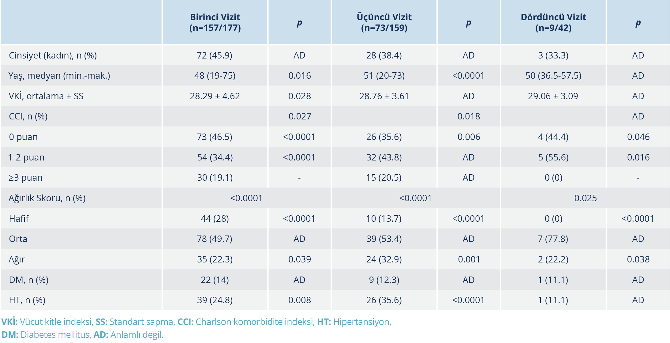 Vizitlerin yapılma zamanı, tanı tarihinden sonra medyan (IQR) gün olarak sırasıyla; birinci vizit 56 (42-64), ikinci vizit 92 (90-96), üçüncü vizit 193 (183-199), dördüncü vizit 371 (366-405) idi. Klinik ağırlık skoruna göre hastaların %33.3’ü hafif, %46.9’u orta, %15.8’i ağır, %4’ü kritik gruptaydı. Kritik hasta grubundaki yedi hasta, sayının az olması nedeniyle istatistiksel hesaplamalarda ağır hasta grubuna dâhil edildi.