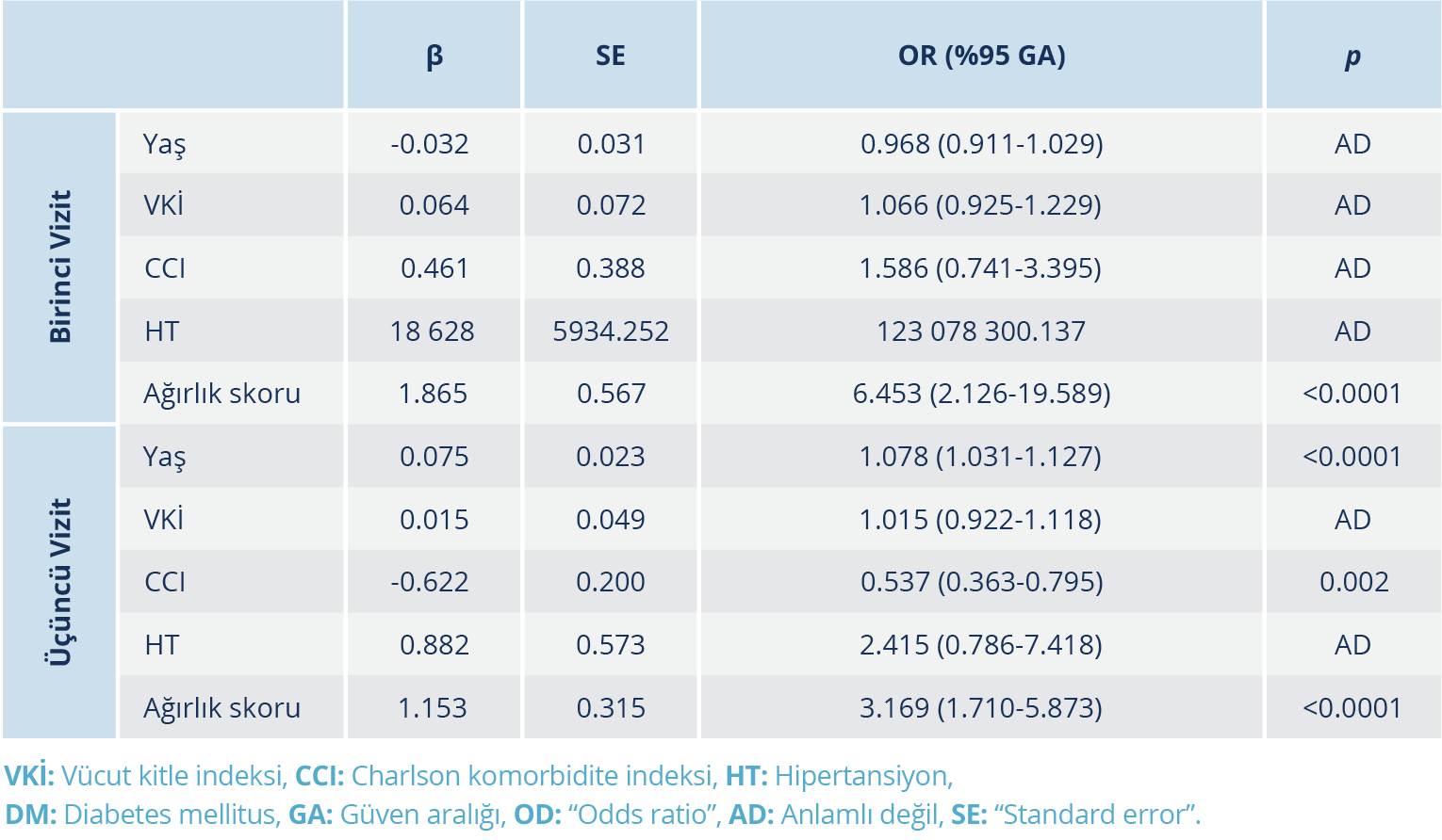 Birinci ve üçüncü vizitte antikor pozitifliği üzerine etkisini değerlendirmek amacıyla yaş, VKİ, CCI, HT ve ağırlık skoru parametrelerinin dâhil edildiği lojistik regresyon modelinde, ağırlık skorunda her bir birim artış, birinci ve üçüncü vizitte antikor testinin pozitif olma oranını sırasıyla 6.453 ve 3.169 katı kadar artırmaktaydı. Charlson komorbidite indeksi skorunda her bir birim artış, üçüncü vizitte antikor testinin pozitif olma oranını 0.537 katı kadar azalttı. Yaşın bir birim artması, üçüncü vizitte antikor testinin pozitif olma oranını 1.078 katı kadar artırmıştı (Tablo 3).