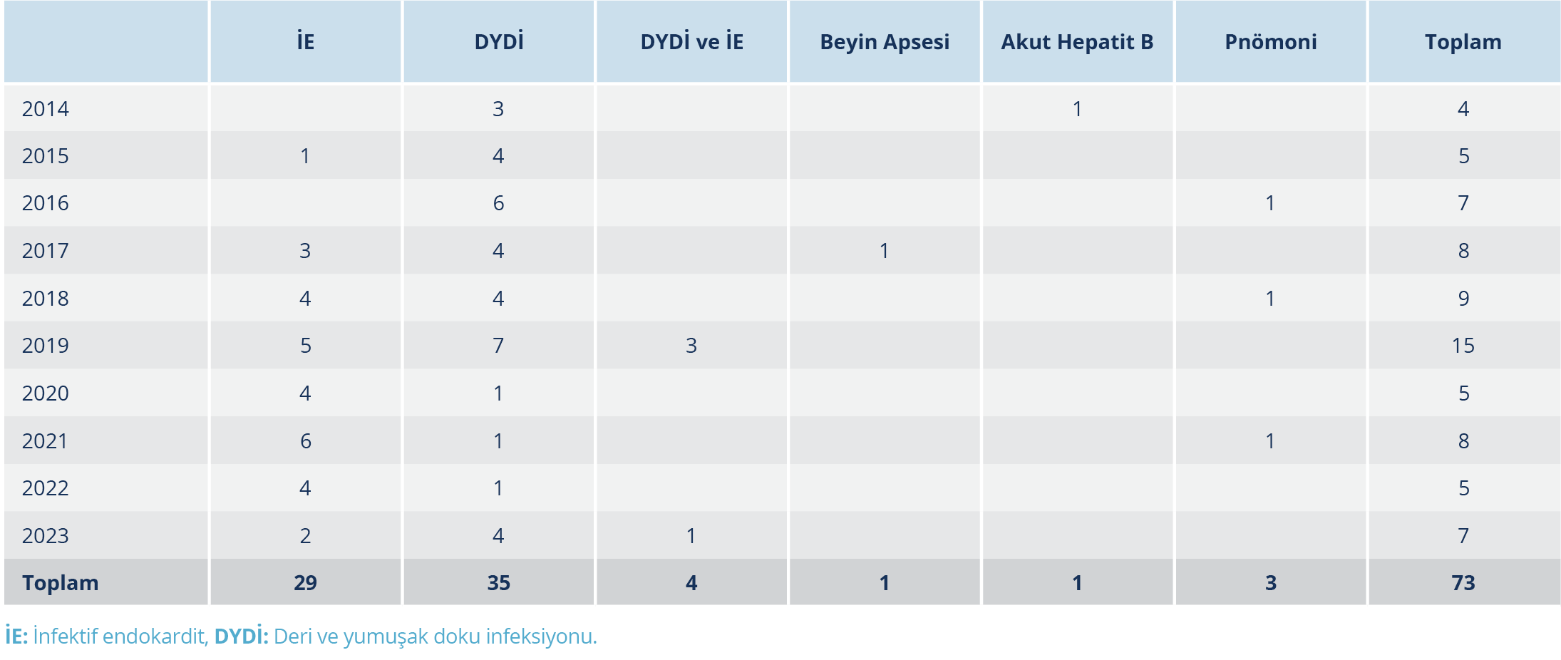 İnfeksiyonların dağılımı; 35 (%47.9) DYDİ, 29 (%39.7) İE, 3 (%4.1) pnömoni, 1 (%1.3) akut hepatit B ve 1 (%1.3) beyin apsesi idi. İnfektif endokardit ile eş zamanlı DYDİ’si olan hasta sayısı 4 (%5.4) olarak tespit edildi. Pnömoni tanısı ile takip edilen üç hastanın ikisinde klinik olarak HIV ilişkili Pneumocystis jiroveci pnömonisi (PJP) vardı. Hastaların 16 (%24.2)’sında radyolojik olarak kanıtlanmış derin ven trombozu mevcuttu. Damar içi madde kullanımı olan kişilerde sıklıkla gözlenen kronik viral infeksiyonların dağılımı; 55 (%83.3) KHC, 2 (%3) KHB, 2 (%3) HIV şeklindeydi; KHC’si olan hastaların 2 (%3.6)’sinde hepatit B, 1 (%1.8)’inde HIV koinfeksiyonu saptandı. Hastaların tamamının ortalama hastanede yatış süresi 26.5 (min.-mak.=1-115) gün olup DYDİ tanılı hastaların 12.7 (min.-mak.=1-60) gün, İE tanılı hastaların ise 40.6 (min.-mak.=6-115) gün idi.
