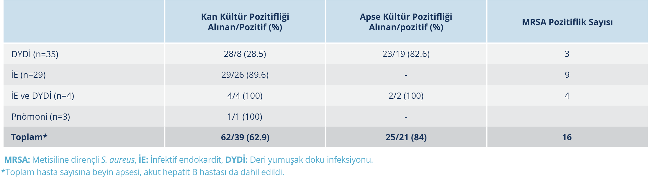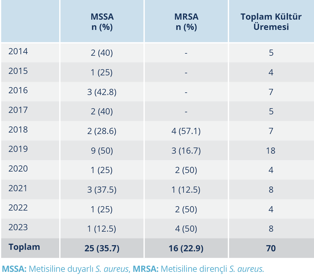 Tespit edilen 73 infeksiyon atağının 62’sinde kan kültürü alınmıştı; bakteriyemi oranı %62.9 (n=39) olup altı atak polimikrobiyaldi. İnfektif endokardit ataklarının 30 (%90.9)’unda kan kültür pozitifliği tespit edildi. Otuz dokuz DYDİ atağının 32 (%82)’sinden kan kültürü alınmış olup bakteriyemi 12 (%37.5)’sinde saptanmıştı. Alınan 25 apse kültürünün 21 (%84)’inde etken izole edilmiş olup dördünün polimikrobiyal olduğu görüldü (Tablo 2). Metisiline duyarlı Staphylococcus aureus (methicillin-sensitive Staphylococcus aureus – MSSA) (n=25, %35.7) kan ve apse kültürlerinde en sık izole edilen etken idi; metisiline dirençli S. aureus (methicillin-resistance S. aureus – MRSA) (n=16, %22.8) ikinci, Streptococcus pyogenes (n=10, %14.2) ise üçüncü sırada sorumlu patojendi. Kültürlerde üreyen etkenlerin dağılımı Tablo 3’te verildi ve MRSA suşlarının hepsi 2018 yılı ve sonrasındaki hastalara aitti (Tablo 4).