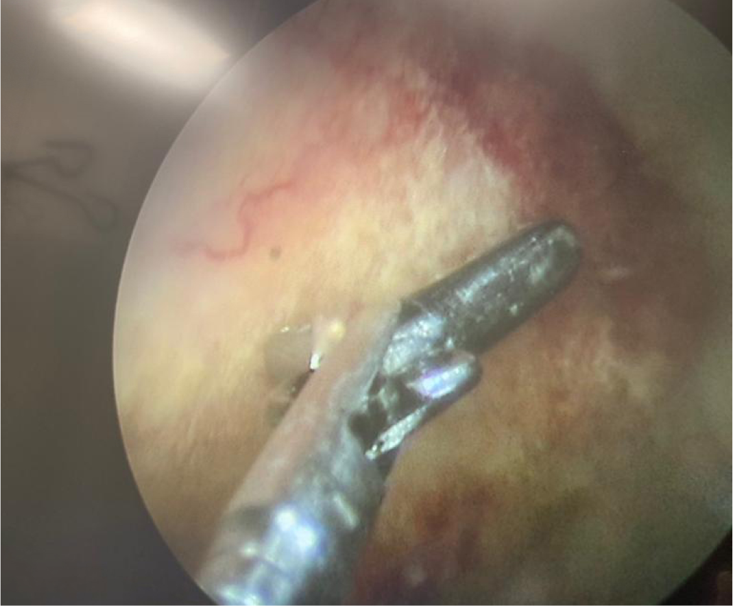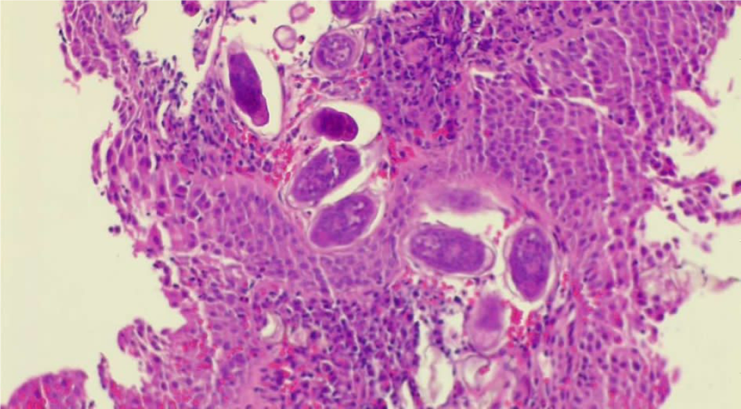 Solid oluşum olması üzerine üroloji ile konsülte edilen hastaya sistoskopi planlandı. Sistoskopide, mesane anterior superior duvarında yaklaşık 2×1 cm’lik papülonoduler lezyon görüldü (Resim 1-2). Lezyondan alınan biyopsi materyalinde lamina propriada parazitik infiltrasyon saptandı ve şiştozoma ile uyumlu olarak raporlandı (Resim 3). Eş zamanlı olarak mikrobiyoloji laboratuvarına gönderilen idrar örneğinde parazit yumurtaları tespit edildi (Resim 4). Hastaya praziquantel 2×40 mg/kg verildi. Bir ay sonra şikayetleri geçen hastanın kontrol idrar tetkikinde özellik yoktu. Sistoskopiyi kabul etmeyen hasta ülkesine döneceği için tekrar kontrole gelmedi.