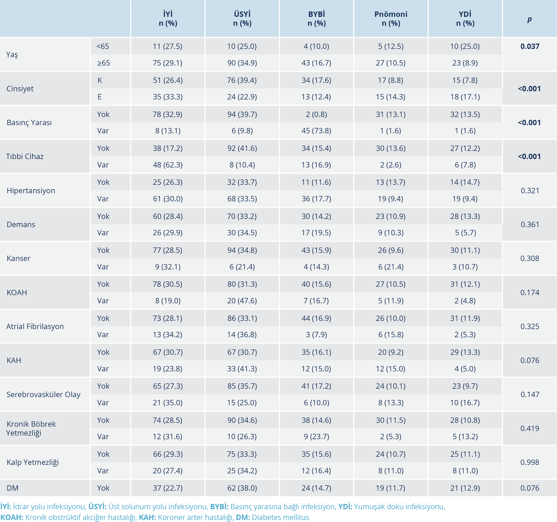 Katılımcıların yaklaşık %33’ünde üst solunum yolu infeksiyonları (ÜSYİ’ler), %20’sinde pnömoni, %30.3’ünde üriner sistem infeksiyonu ve %15.3’ünde basınç yarasına bağlı infeksiyon tespit edildi (Tablo 2).