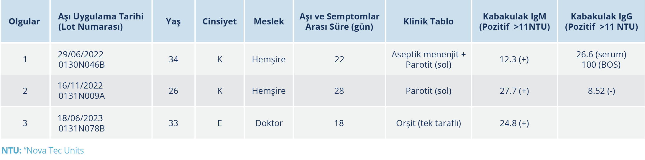 İkisi hemşire, biri doktor olarak çalışan üç sağlık çalışanı, KKK aşısı sonrası gelişen orşit, parotit ve parotitin eşlik ettiği aseptik menenjit tanısı ile izlendi. Olguların demografik özellikleri ve klinik tanıları Tablo 1’de verildi.