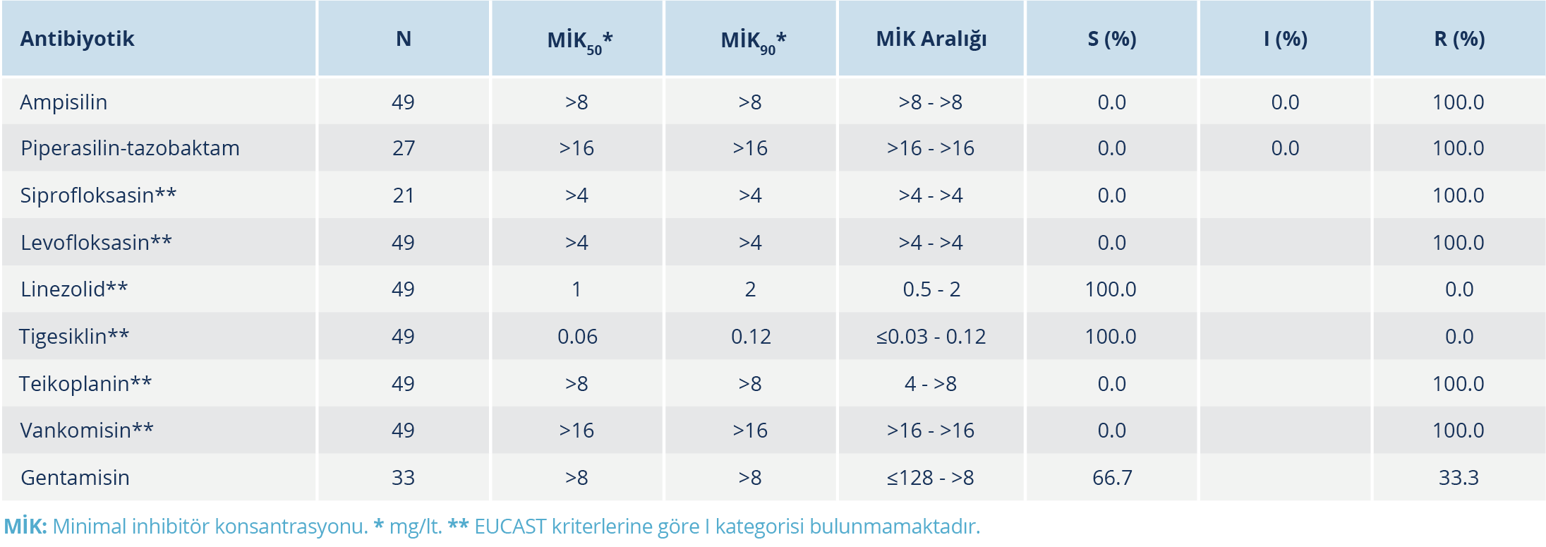 Sonuç: E. faecium izolatlarında antibiyotiklere karşı direnç, beklendiği üzere E. faecalis izolatlarına kıyasla daha yüksek bulundu. E. faecium izolatlarında vankomisin ve teikoplanin direnci tespit edilirken, E. faecalis izolatlarında direnç saptanmadı. Linezolid ve tigesiklinin her iki Enterococcus türüne karşı etkili olduğu in vitro olarak belirlendi.