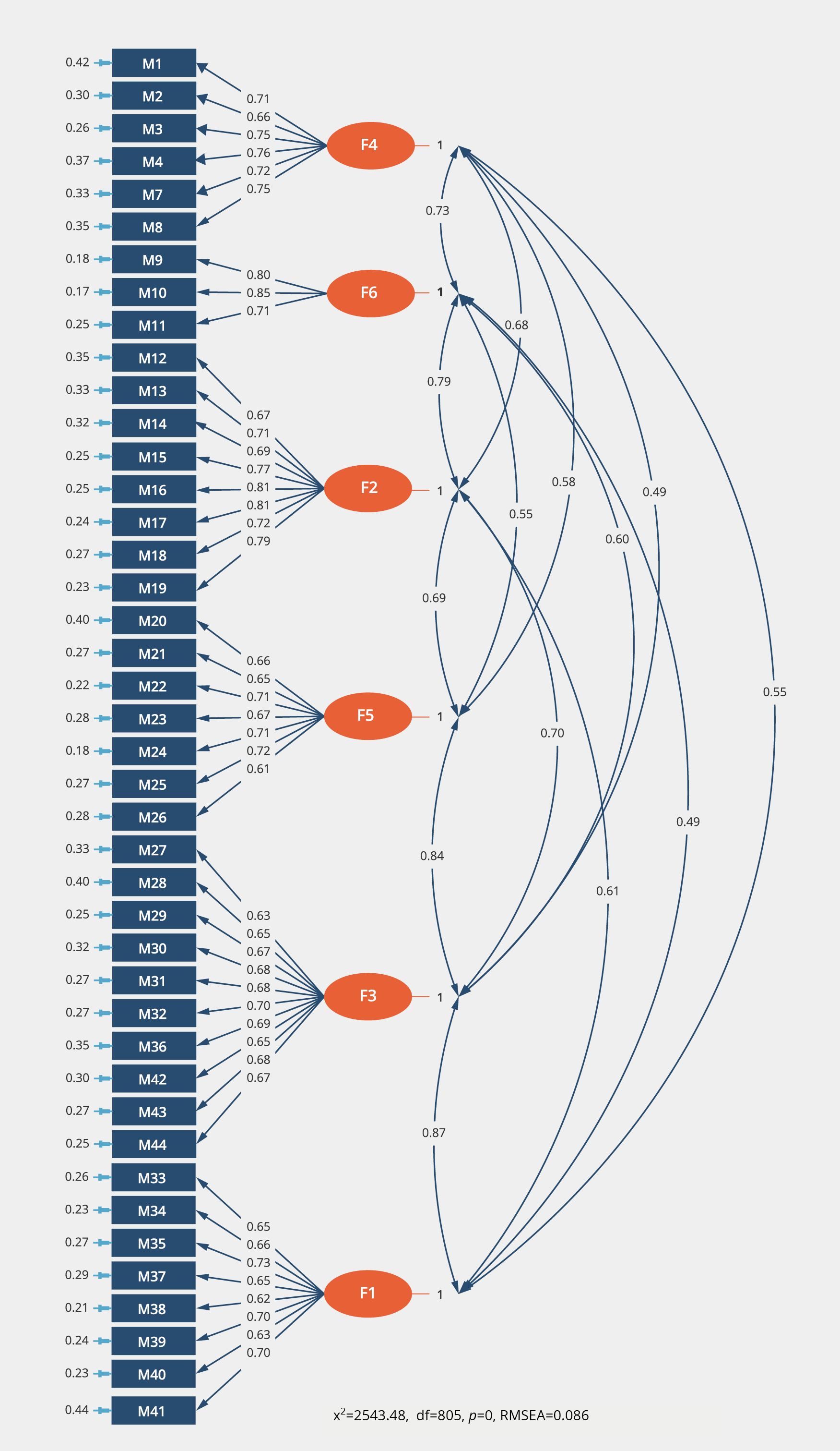 Temel bileşenler analizi (TBA)’yle birlikte Varimax döndürme yöntemi kullanılarak AFA gerçekleştirildi. Faktörlerin sayı tespiti için çizgi grafiği, öz değer puanı ve açıklanan varyans kriterlerine göre ölçek faktör yapısı ortaya çıkarıldı. Açımlayıcı faktör analizinin sonucunda M5 ve M6 numaralı maddeler binişik madde olmaları nedeniyle analizden çıkarıldı. Doğrulayıcı faktör analizi sonucunda ise herhangi bir madde çıkarılmadı ve böylece ölçek toplam 42 madde ile son halini aldı (Şekil 1).