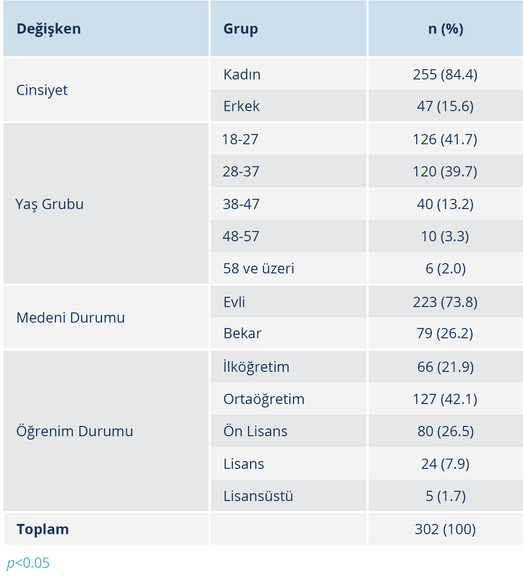 Ölçek geliştirme kapsamında iki ayrı veri seti oluşturuldu. İlk veri seti, İstanbul’un Kartal ilçesinde özel bir sağlık kurumuna başvuran 320 hastadan elde edildi. Hatalı doldurmadan dolayı 18 form kullanılmadı ve geriye kalan 302 form ile analiz gerçekleştirildi. İkinci veri seti kapsamında, doğrulayıcı faktör analizi (DFA) için yine İstanbul’un Kartal ilçesinde bulunan farklı bir sağlık kurumuna başvuran 327 hastaya anket uygulandı; 27 form hatalı doldurma nedeniyle elendi ve geriye kalan 300 form ile analiz gerçekleştirildi. Araştırmaya katılan hastaların 255 (%84.4)’i kadın, 126 (%41.7)’sı 18-27 yaşları arasında, 223 (%73.8)’ü evli ve 127 (%42.1)’si ortaöğretim (lise) mezunu idi. Hastaların demografik özellikleri Tablo 1’de sunuldu.
