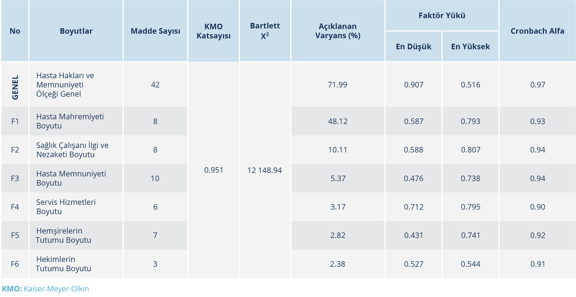 Bulgular: Ölçeğin toplam 42 maddeden ve altı faktörden oluşan bir yapıya sahip olduğu belirlendi. Doğrulayıcı faktör analizinin (DFA) uyum indeksi değerleri sırasıyla χ²/sd=3.16, RFI=0.96, NFI=0.96, CFI=0.97, RMSEA=0.0086 ve RMR=0.039 olarak hesaplandı. Bu bulgular doğrultusunda ölçeğin model-veri uyumunun kabul edilebilir düzeyde olduğu değerlendirildi. Güvenirlik analizleri kapsamında, Cronbach alfa iç tutarlılık katsayıları “Hasta Mahremiyeti” boyutu için 0.93, “Sağlık Çalışanı İlgisi ve Nezaketi” boyutu için 0.94, “Hasta Memnuniyeti” boyutu için 0.94, “Servis Hizmetleri” boyutu için 0.90, “Hemşirelerin Tutumu” boyutu için 0.92 ve “Hekimlerin Tutumu” boyutu için 0.91 olarak hesaplandı.