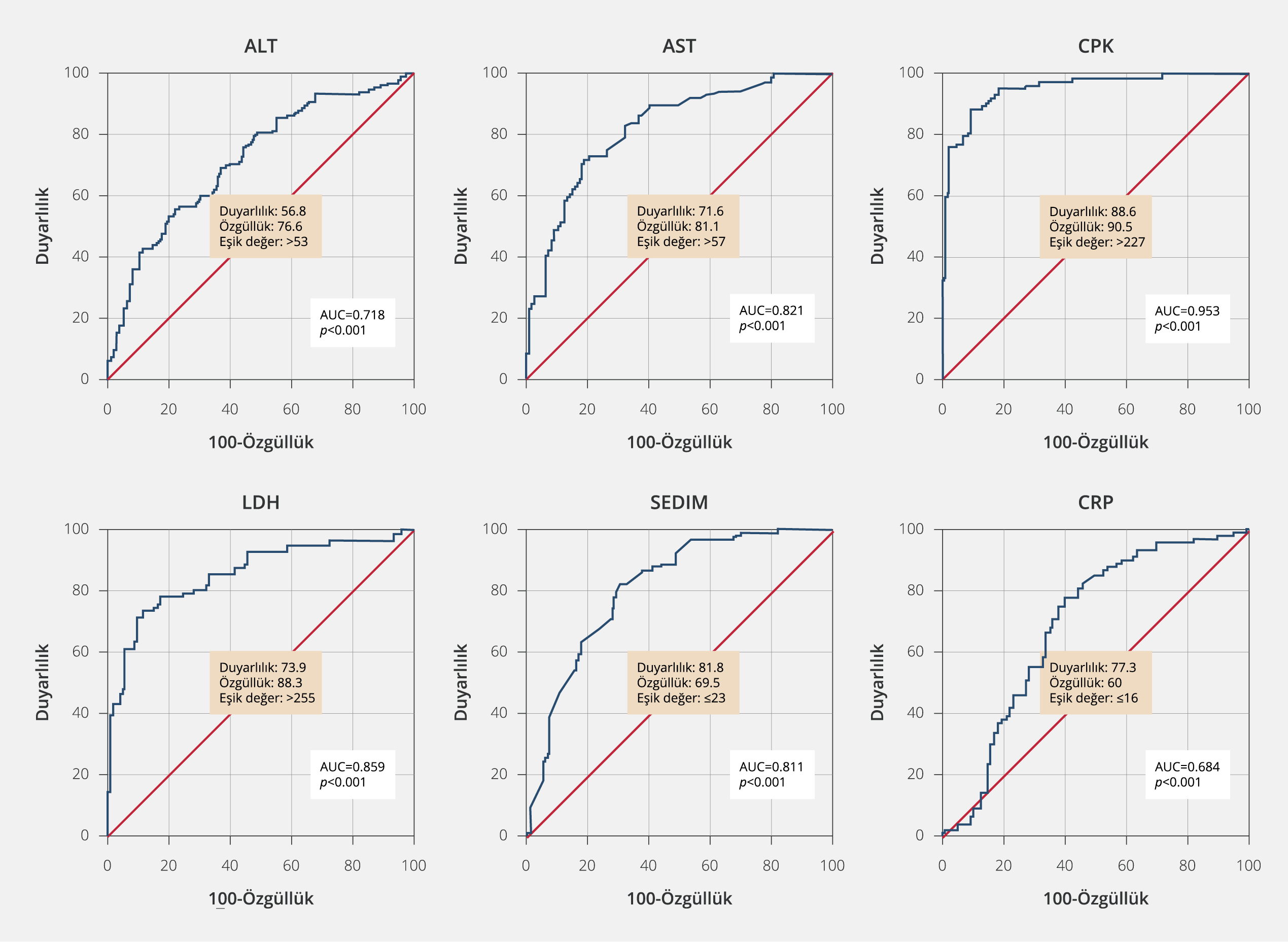 Hastaneye ilk başvuru anında ölçülen biyokimyasal parametrelere ait ROC eğrisi analiz sonuçları Tablo 3 ve Şekil 1’de sunuldu. Akut bruselloz ve KKKA hastaları arasında CPK için ROC eğrisi altında kalan alan (AUC) 0.953 olarak hesaplandı; CPK için belirlenen eşik değer 277 U/lt olup bu değerin üzerindeki ölçümler KKKA’yı göstermede %88 duyarlılık ve %90 özgüllüğe sahipti. Eritrosit sedimantasyon hızı için yapılan ROC analizinde, 23 mm/saat kesim değeri ile AUC 0.811 bulundu. Bu değerin üzerindeki ölçümler akut brusellozu göstermede %81 duyarlılık ve %69 özgüllüğe sahipti. LDH için yapılan analizde ise 255 U/lt kesim değeri ile AUC 0.859 olarak saptandı; bu değerin üzerindeki ölçümler KKKA’yı göstermede %74 duyarlılık ve %88 özgüllük ile anlamlı bulundu.