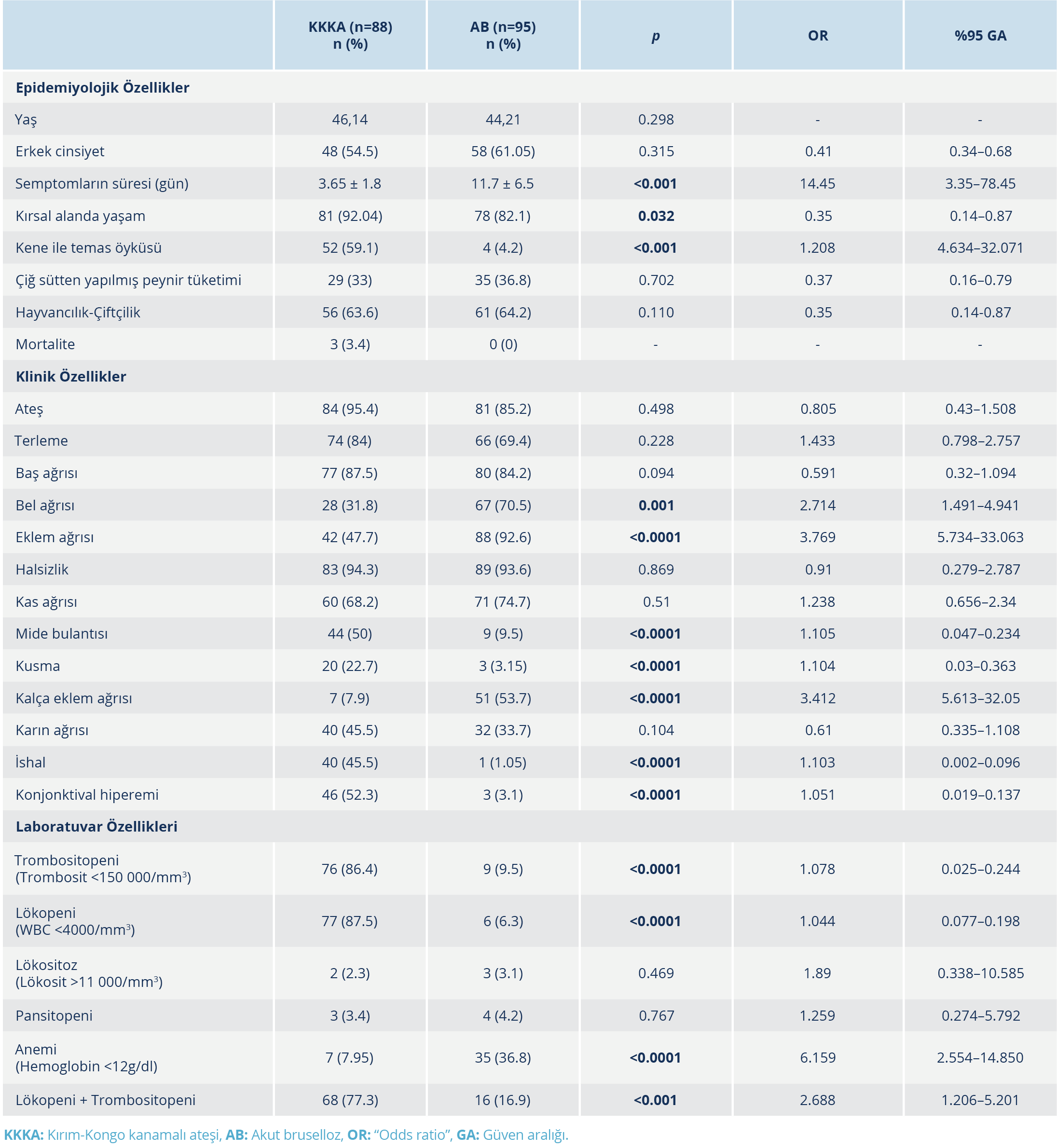 Yaş ortalaması KKKA grubunda 46.14 yıl, akut bruselloz grubunda ise 44.21 yıl olarak hesaplandı. Erken cinsiyet oranı KKKA grubunda %54.5 ve akut bruselloz grubunda %61.05 idi. Yaş, cinsiyet, kırsal yaşam ve hayvancılıkla uğraşma gibi epidemiyolojik değişkenler açısından gruplar arasında anlamlı düzeyde fark saptanmadı (p>0.05).