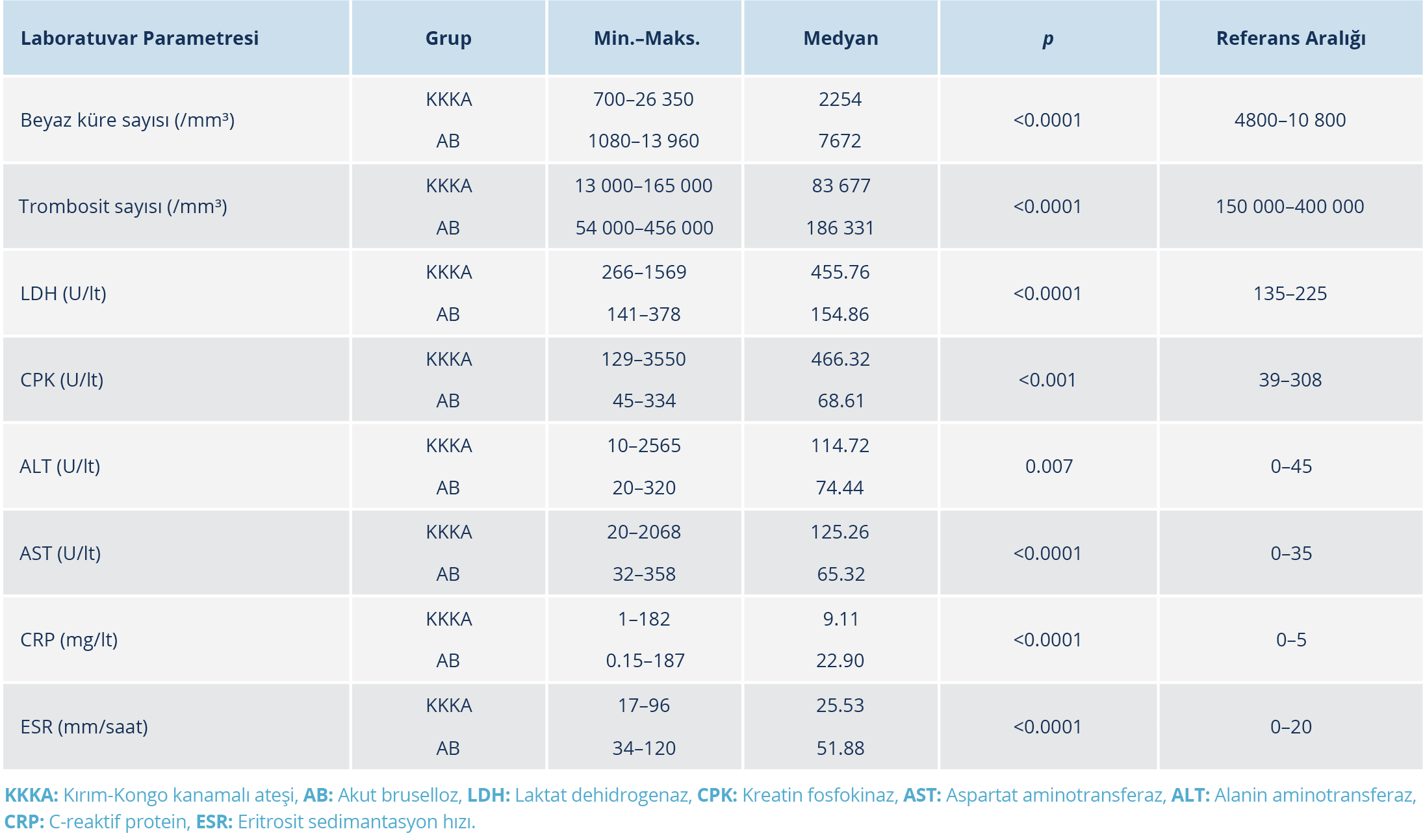 Laboratuvar bulguları incelendiğinde, hastaneye başvuru sırasında beyaz küre sayısının KKKA olgularında medyan değeri 2254/mm3, akut bruselloz olgularında ise 7672 /mm3 olduğu görüldü. Trombosit sayısının medyan değeri KKKA grubunda 83 677 /mm3, akut bruselloz grubunda ise 186 331 /mm3 idi. Beyaz küre ve trombosit sayıları KKKA hastalarında anlamlı düzeyde daha düşük bulundu (p<0.0001). ALT medyan değeri KKKA grubunda 114.72 U/lt, akut bruselloz grubunda 74.44 U/lt; LDH medyan değeri KKKA grubunda 455.76 IU/lt, akut bruselloz grubunda 154.86 U/lt; CPK medyan değeri KKKA grubunda 466.32 U/lt, bruselloz grubunda 68.61 U/lt idi. AST, LDH ve CPK düzeyleri KKKA grubunda istatistiksel olarak anlamlı derecede daha yüksek bulundu (p<0.0001); ALT düzeyi için bu fark p=0.007 olarak belirlendi. Gruplar CRP ve ESH değerleri açısından karşılaştırıldığında akut bruselloz olgularında bu parametrelerin anlamlı düzeyde daha yüksek olduğu tespit edildi (p<0.0001) (Tablo 2).