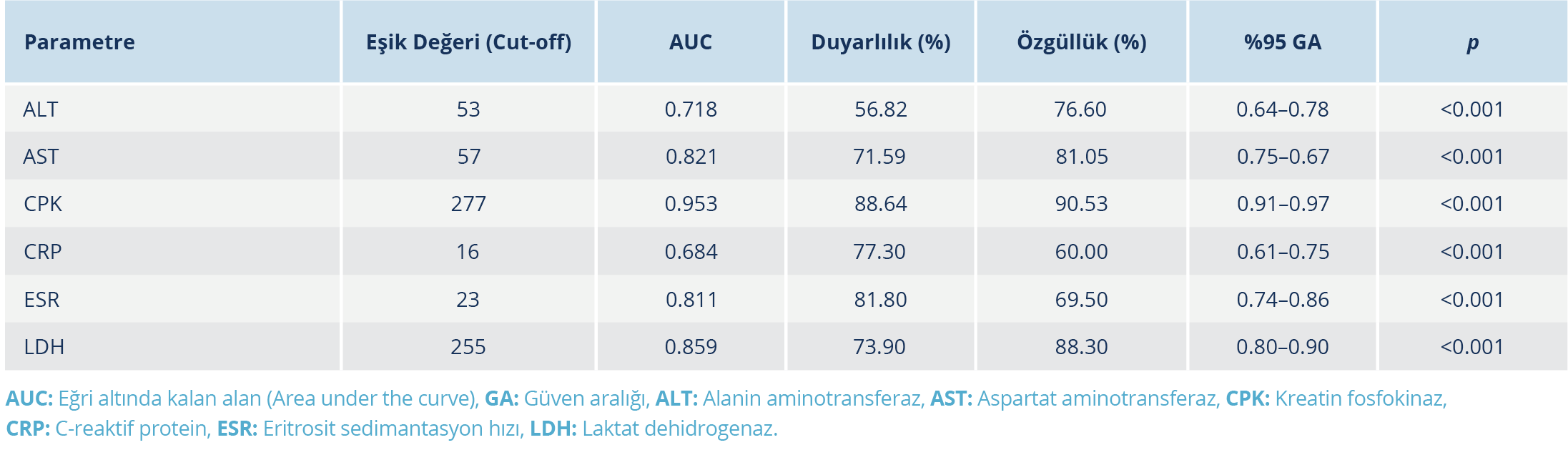 Tablo 3. Akut Bruselloz ve KKKA Hastalarının Başvuru Anında Elde Edilen Biyokimyasal Parametrelerinin ROC Analizi