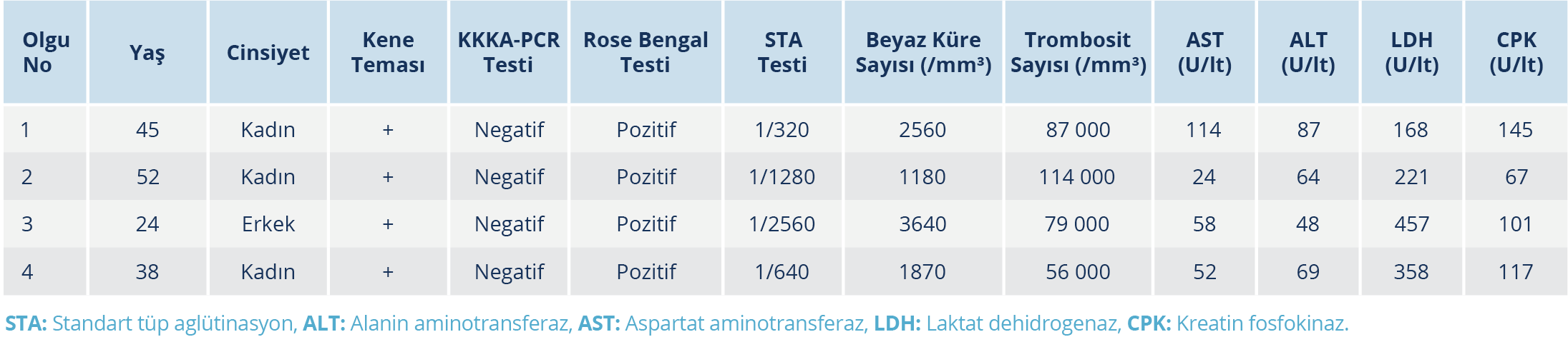 Çalışma sürecinde, KKKA ön tanısı ile yatırılan ve tedavi edilen ancak daha sonra akut bruselloz tanısı konulan dört olgu tespit edildi. Bu hastaların tümü; son 14 gün içinde kene tutunma öyküsü bulunan, ateş yakınması ile başvuran, başvuru anında bisitopeni (lökopeni ve trombositopeni) saptanan ve KKKA-PCR test sonucu negatif, bruselloz serolojisi pozitif olan hastalardı. Bu dört hastanın demografik ve laboratuvar özellikleri Tablo 4’te sunuldu.