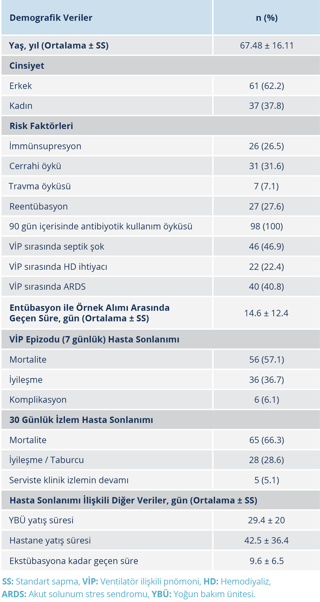 Çalışmaya alınan 98 hastanın 61(%62.2)’i erkek, 37 (%37.8)’si kadındı. Tüm hastaların yaş ortalaması 67.5 yıl olarak bulundu. Ventilatör ilişkili pnömoni epizodu öncesinde hastaların tamamında 90 gün içerisinde antibiyotik kullanım öyküsü mevcuttu. Otuz bir hastada cerrahi girişim öyküsü, 27 hastada reentübasyon, 26 hastada immünsupresyon, yedi hastada travma öyküsü vardı. Yedi günlük VİP epizodu sırasında hastaların 56’sı kaybedildi ve 36 hasta iyileşti; üç hastada bakteriyemi, iki hastada plevral efüzyon, bir hastada pnömotoraks olmak üzere altı hastada ise komplikasyon gelişti. Otuz günlük hasta izleminin sonunda hastaların 65’i kaybedilirken 28 hasta taburcu edildi. Otuz günlük sürenin sonunda beş hastanın klinik izlemi serviste devam etmekteydi. Hastaların demografik verileri, risk faktörleri ve sonlanım bilgileri Tablo 1’de sunuldu.