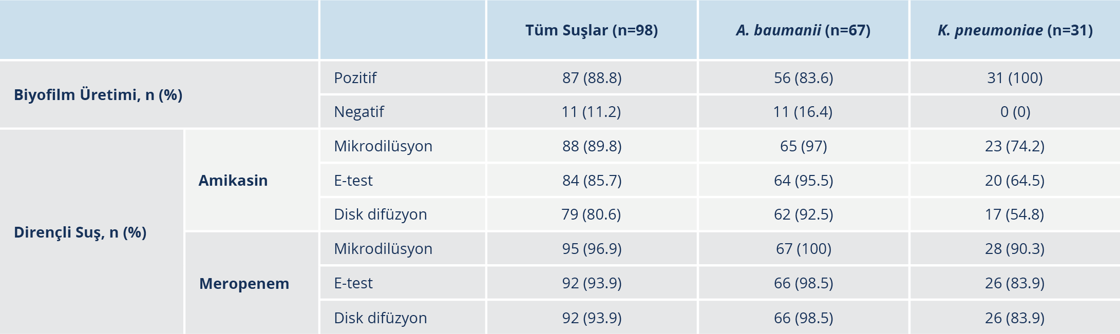 Bulgular: Çalışmaya dahil edilen, 98 suşun 67’si A. baumanii, 31’i ise K. pneumoniae olarak tanımlandı. K. pneumoniae suşlarının tamamında, 67 A. baumanii suşlarının ise %83.6’sında biyofilm üretimi saptandı. K. pneumoniae olarak tanımlanan suşlarda biyofilm üretimi anlamlı düzeyde daha yüksek saptandı (p=0.015). Mikrodilüsyon yöntemiyle belirlenen direnç oranları A. baumannii suşlarında K. pneumoniae suşlarına göre meropenem (p=0.003) ve amikasin (p=0.042) için istatistiksel olarak anlamlı derecede daha yüksek bulundu. Biyofilm üretimi yapan 31 K. pneumoniae suşunda, e-test ve disk difüzyon yöntemleri ile mikrodilüsyon yöntemi karşılaştırıldığında, direnç oranları açısından meropenem için amikasine kıyasla daha yüksek bir uyum saptandı (meropenem kappa=0.71, amikasin kappa=0.32).