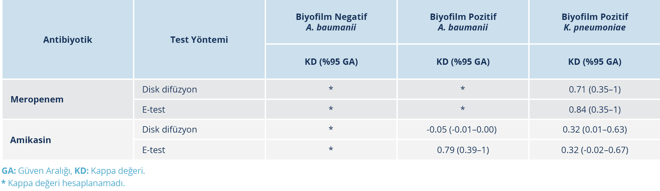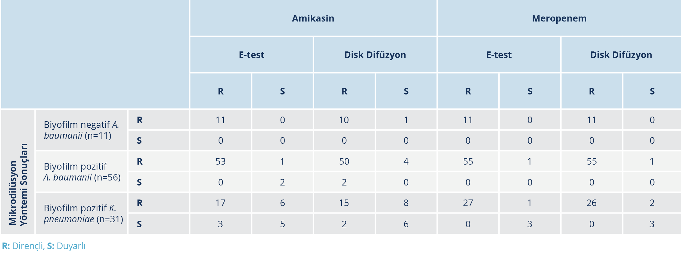 Biyofilm üreticisi olmayan 11 A. baumanii suşunun tamamı, mikrodilüsyon ve e-test yöntemleriyle meropeneme ve amikasine dirençli saptandı. Mikrodilüsyon yöntemiyle amikasine dirençli saptanan bir suş disk difüzyon yöntemiyle amikasine duyarlı tespit edildi. Mikrodilüsyon yöntemiyle duyarlı suş sayısı yetersiz olduğundan bu grupta kappa değeri hesaplanamadı.