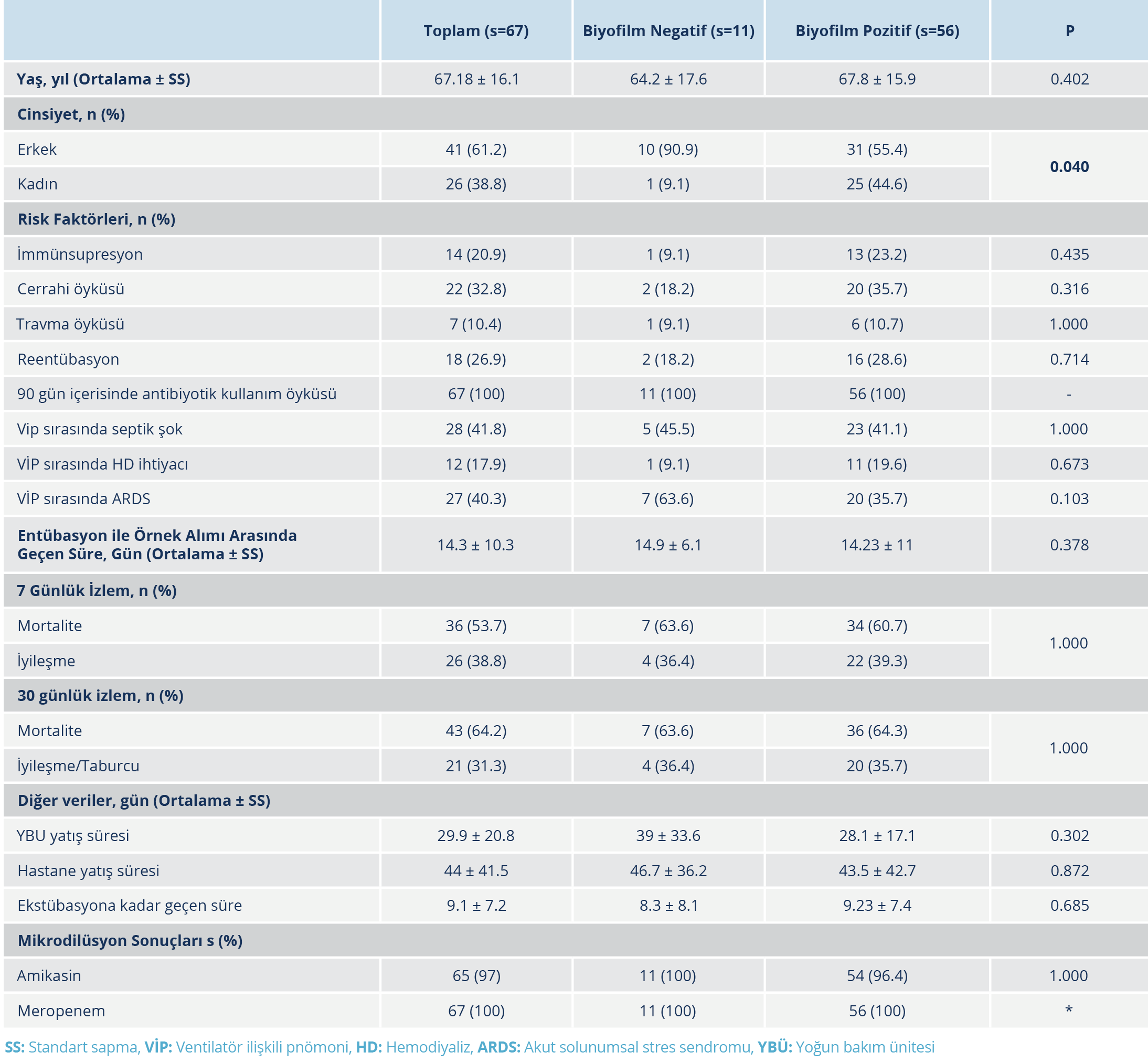 Biyofilm ilişkili infeksiyon düşünülen hastaların klinik ve laboratuvar verilerinin birlikte değerlendirilmesi açısından önemli olan çalışmamızda, hastaların altta yatan çeşitli risk faktörleri, VİP epizodları ve 30 günlük izlem sonlanımları, biyofilm üretimi ve farklı yöntemlerin antibiyotik duyarlılık test sonuçları ile birlikte değerlendirildi.