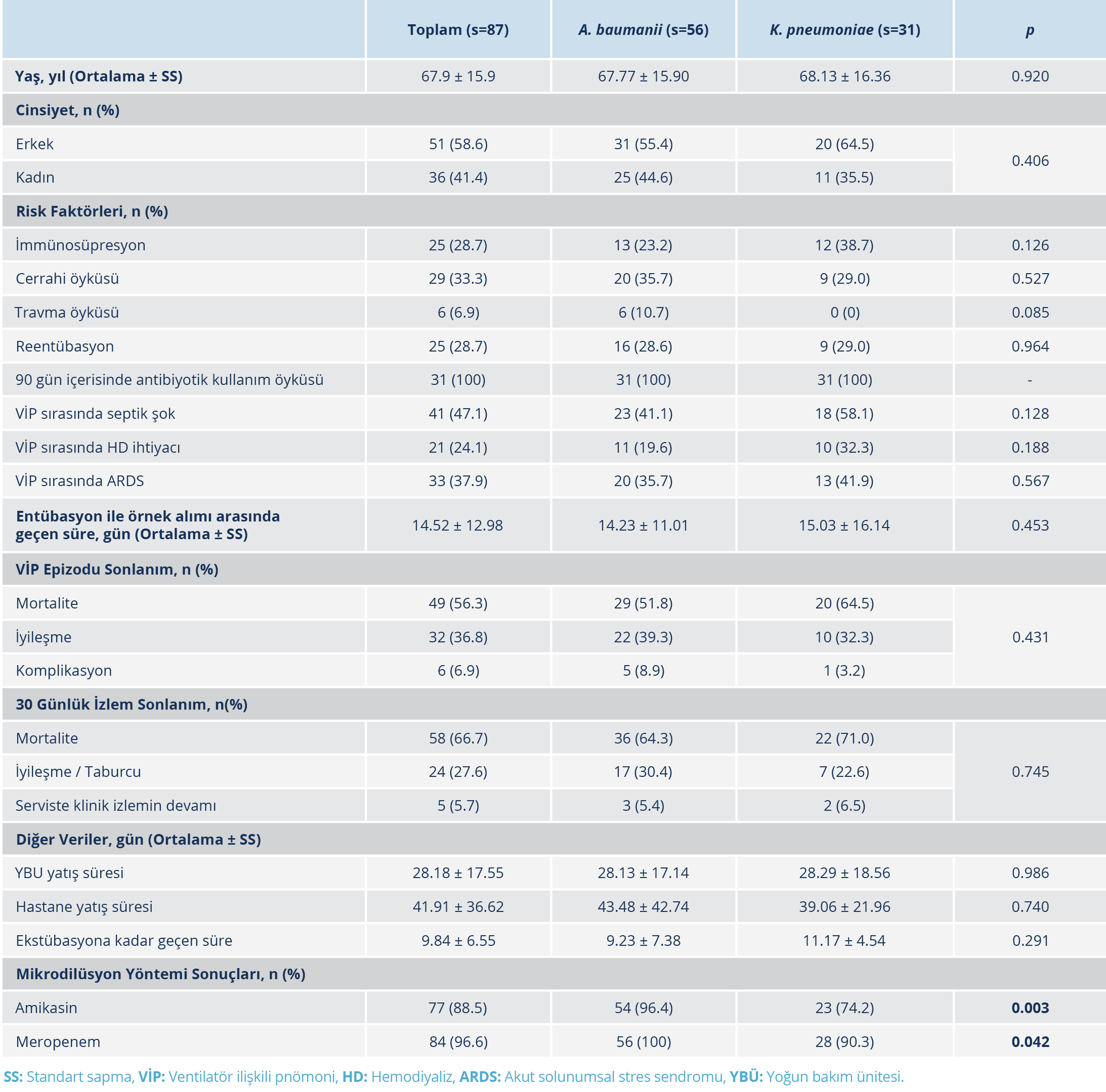 Ventilatör ilişkili pnömoni etkeni olarak belirlenen A. baumanii ve K. pneumoniae suşları pasajlanarak çalışma başlangıcına kadar -20°C’de boncuklu stok besiyeri (Orbak, Türkiye) içerisinde saklandı. Hastaların yedi günlük VİP epizodu ve 30 günlük izlemi kaydedildi. Hastaların demografik verileri ve risk faktörleri ise hastane kayıt sisteminden elde edildi. Toplanan veriler aşağıda sunuldu: