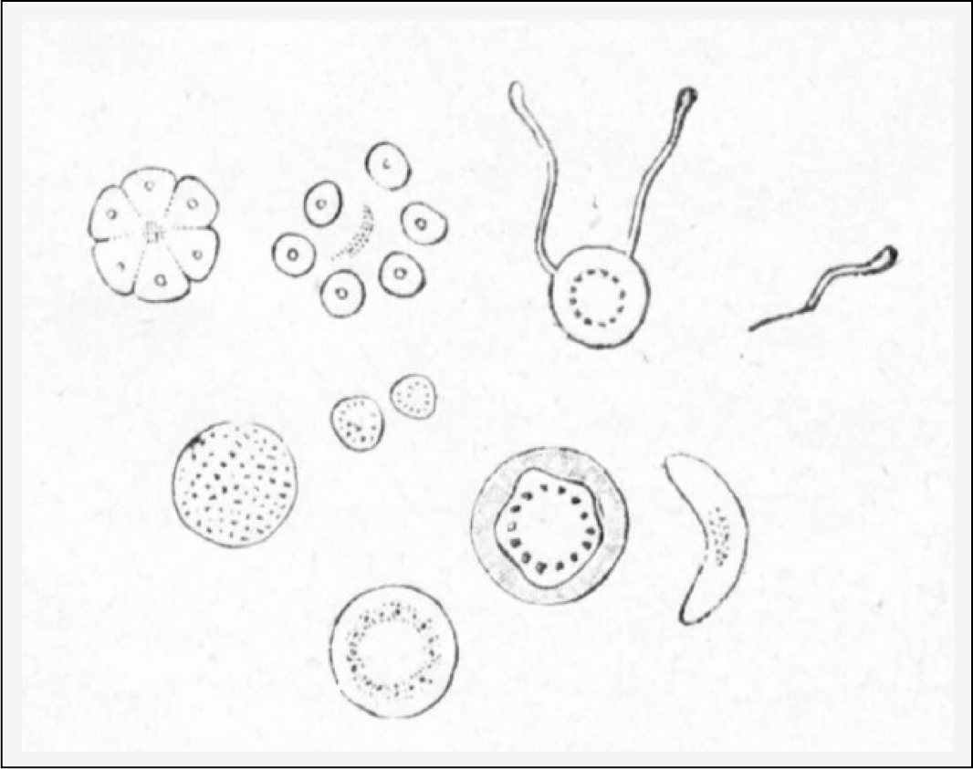 Eserin ikinci bölümünde, Sıtmanın Bulunduğu Yerler başlığı altında sıtmanın coğrafi dağılımına ilişkin bilgiler verilmiştir. İsmail Hakkı’ya göre dünyada sıtmanın bulunmadığı pek az yer vardır; sıtmanın çoğalmasına hizmet eden ise su birikintileri ve bataklıklardır. Ancak sadece bunların olması bir bölgenin sıtmalı olduğu anlamına gelmez çünkü hastalık etkenini taşıyan insanların ve bu etkenleri bulaştıran sivrisineklerin varlığı olmadan gelişemez. Yine de İsmail Hakkı, durgun ve birikinti suların bulunduğu yerlerde sıtma olgularının artış gösterdiğini belirtmiştir. İsmail Hakkı, eserinin üçüncü bölümü olan Sıtma Neden Oluyor? başlığında bu konuya şu ifadelerle açıklık getirmiştir: “Çukurları, durgun suları çok olan yerlerde sıtmanın çok olması bu sivrisineklerin yumurtalarını durgun sulara bırakmalarından yani öyle sulak yerlerin, sivrisineklerin çoğalmaları yetişmeleri için muvafık olmasından ileri gelir” (50). Sıtma etkeni olan parazitlerin mikroskop altındaki incelemelerinde ise farklı morfolojik şekillerde görüldükleri tespit edilmiştir (Resim 2).