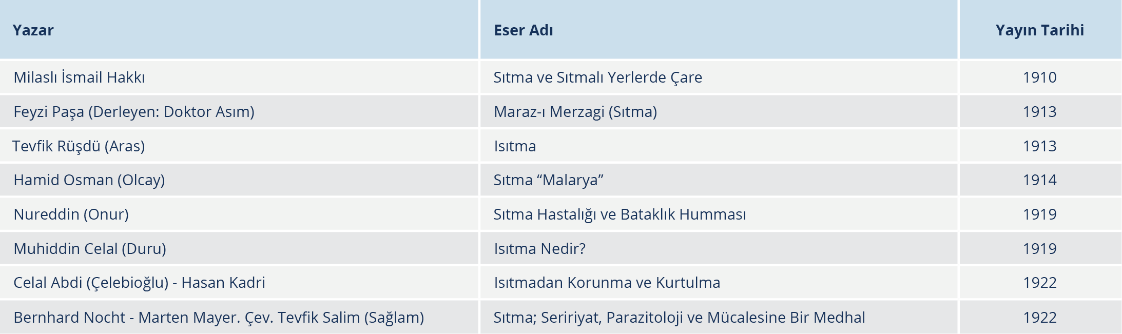 - Aydın MB, Ertaş MY. Bulaşıcı hastalıklarla mücadelede neşriyat: sıtma konulu kitaplar (1908-1928). In: Köse Ş, Büke Ç, Çakmak F, Akçiçek E, editors. Tarihsel süreçte Anadolu’da sıtma. Ankara: Gece Kitaplığı; 2017. p. 361-96.