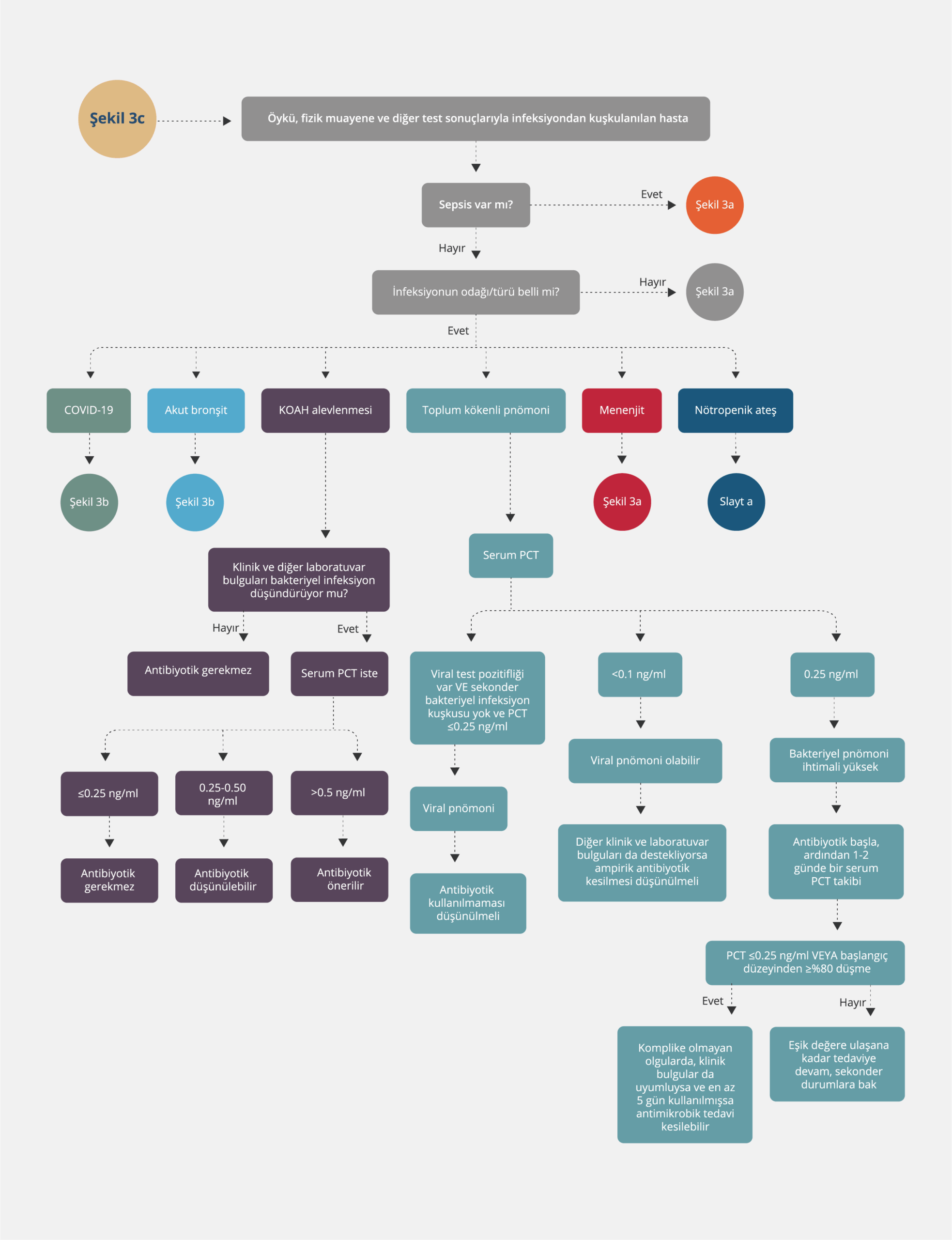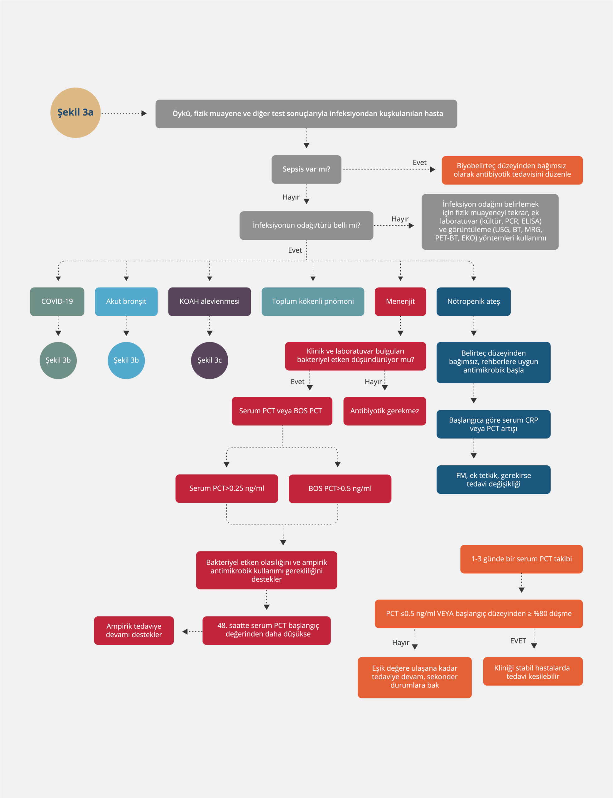 Klinik değerlendirme ve rehber önerilerine dayalı takibe göre üstünlük göstermediği için sepsisli hastalarda serum PCT veya CRP düzeylerindeki artışa dayanarak antibiyotik tedavisinin genişletilmesi önerilmez. Klinik olarak iyileşmiş, stabil sepsis hastalarında serum PCT düzeyinin ≤0.5 ng/ml olması veya başlangıç değerine göre ≥%80 oranında azalması halinde antibiyotik tedavisinin kesilmesi önerilir. Antibiyotik tedavisinin kesilme kararında, serum CRP düzeyinin kullanımı serum PCT’nin kullanımına kıyasla daha az güvenilirdir; ancak PCT düzeyinin ölçülemediği koşullarda, CRP’nin ≤ 25mg/lt düzeyine inmesi veya başlangıç düzeyinden >%50 oranında azalması durumunda antibiyotik tedavi süresinin belirlenmesinde klinik değerlendirmeye yardımcı bir kriter olarak göz önünde bulundurulabilir.