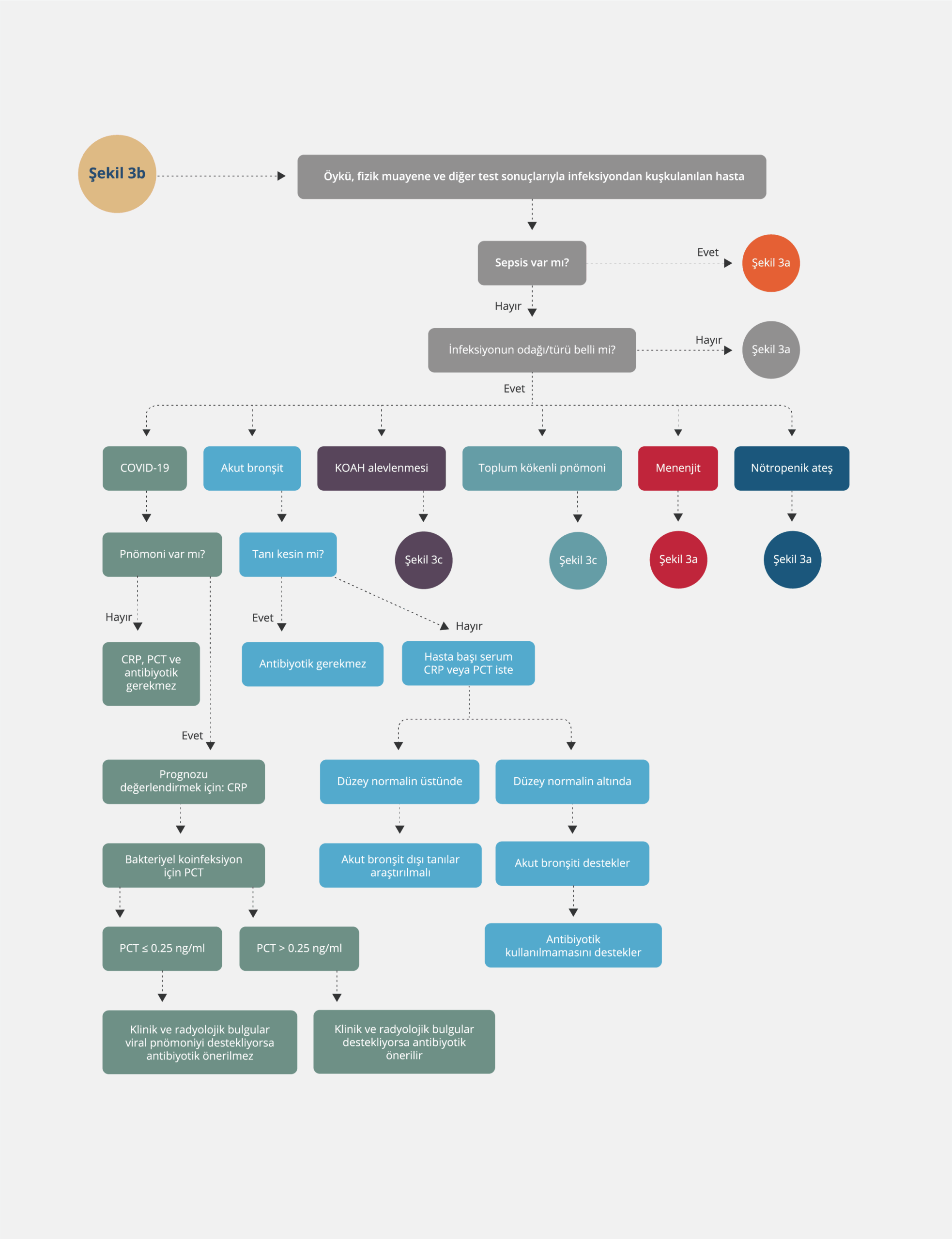 Yoğun bakım gerektirmeyen TGP olgularında, ayaktan veya yatırılarak izlenen bireylerde klinik bulguların da iyileşmiş olması koşuluyla, 1–2 günde bir yapılan CRP veya PCT ölçümlerinde belirgin düşüş saptanması durumunda antibiyotik tedavisi sonlandırılabilir. Antimikrobiyal tedavinin kesilebileceği eşik serum CRP düzeyi net olarak tanımlanmamış olmakla birlikte, serum PCT düzeyinin başlangıç değerine göre ≥%80 oranında azalması ya da ≤ 0.25 ng/ml’ye düşmesi halinde antibiyotik tedavisi sonlandırılabilir.