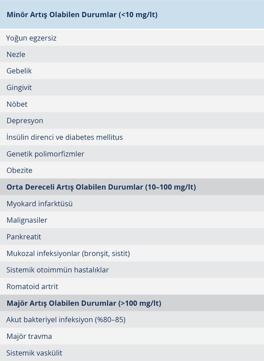 Serum CRP düzeylerinin belirlenmesinde, maliyeti orta düzeyde olan immünoassay ve lazer nefelometri yöntemleri kullanılmaktadır. Sağlıklı erişkinlerin çoğunda CRP düzeyi 3 mg/lt’nin altındadır. C-reaktif proteindeki minör artışların klinik önemi konusu hâlen tartışmalıdır. Ancak klasik yöntemler, 3–10 mg/lt arasındaki konsantrasyonları tanımlamada çok yeterli değildir. Bu nedenle, bu düzeyleri doğru bir şekilde ölçebilmek için yüksek duyarlılığa sahip (hs-CRP) yöntemler kullanılmaktadır. Genel olarak 10 mg/lt’nin üzerindeki değerler klinik açıdan önemli inflamatuar hastalığı yansıtır; 10–100 mg/lt arasındaki değerler hafif artışı temsil ederken, >100 mg/lt belirgin artışı gösterir. Çok yüksek CRP düzeyi (>150 mg/lt) olan hastaların büyük çoğunluğunda bakteriyel bir infeksiyon bulunmaktadır; ancak sistemik vaskülitler ve majör travmalarda da yüksek düzeyler tespit edilebilir. C-reaktif protein düzeyi >500 mg/lt olanların %88’inde infeksiyon olduğu gösterilmiştir (Tablo 1). Farklı klinik durumların serum CRP düzeylerine etkisi Tablo 2’de sunulmuştur.