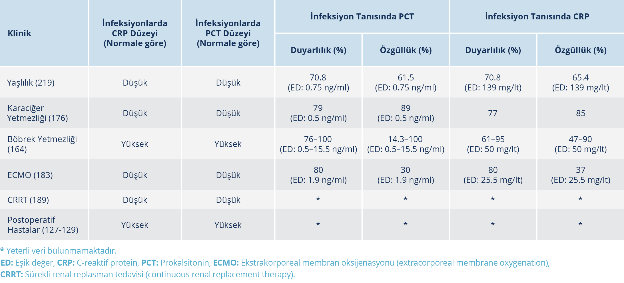 Ekstrakorporeal membran oksijenasyonu (extracorporeal membrane oxygenation, ECMO) ve sürekli renal replasman tedavisi (continuous renal replacement therapy, CRRT) uygulanan hastalarda biyobelirteçlerin infeksiyon tanısındaki yeri mevcut veriler ışığında henüz net olarak belirlenememiştir. Bu konuda öneri yapılabilmesi için iyi tasarlanmış ek çalışmalara ihtiyaç vardır.