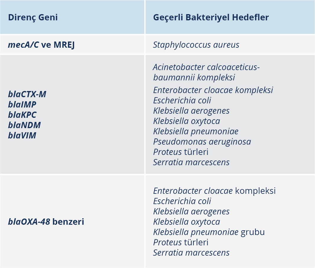 • Yerel antimikrobiyal direnç paternlerine uygun olarak, panelde yer alan direnç genlerinin erken tanımlanması gereken olgular (Örneğin Türkiye’de Gram-negatif bakterilerde sık görülen yüksek karbapenemaz direnci),