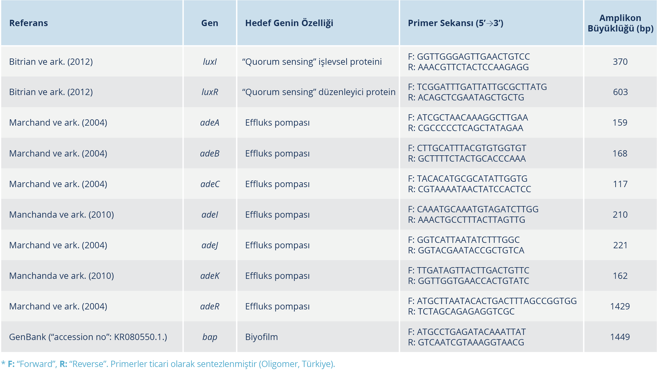 Tablo 1. Acinetobacter baumannii İzolatlarının Virülans Faktörlerinin Saptanması İçin Kullanılan Primerler* (6-9).