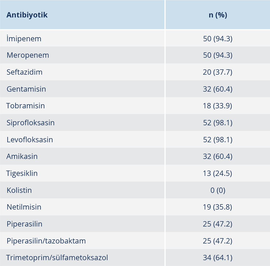 Bulgular: Çalışmamızda bap geni %1.9 oranı ile en düşük saptanan gen olurken, effluks pompa gen bölgelerinden olan adeA geni tüm izolatlarda (%100) tespit edildi. Diğer effluks pompa genleri olan adeB %96.2, adeC %45.3, adeI geni %86.8, adeJ %67.9, adeK %98.1 ve adeR %98.1 oranlarında saptandı. Hücreler arası iletişim genlerinden olan luxI %41.5 oranında, luxR geni ise %47.2 oranında tespit edildi. Karbapenemlere ve kinolon grubu antibiyotiklere karşı yüksek oranda direnç saptanırken, kolistine karşı direnç tespit edilmedi.