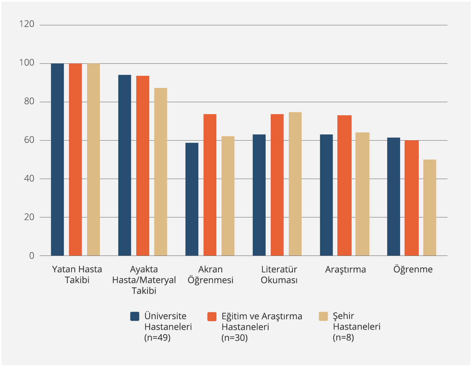 Kliniklerde en yaygın uygulanan eğitim etkinliği sunum (%98.9) iken en azı uygulanan etkinlik kurs (%13.8) idi (Şekil 3). Öğrenme etkinliği olarak en yaygın uygulama yatan hasta takibi (%100) iken, öğretme (%59.8; n=52) ve araştırma (%64.4; n=56) uygulamalarının daha düşük oranlarda gerçekleştirildiği bildirildi (Şekil 4). Eğitim kliniklerinin %63’ünde öğretim üyelerinin seminer ve sunum saatlerinde anlatıcı olarak görev aldığı görüldü. Anlatıcı olarak görev yapan öğretim üyeleri açısından üniversite ve eğitim ve araştırma hastaneleri lehine istatistiksel olarak anlamlı bir fark saptandı (p=0.006) (Tablo 5).