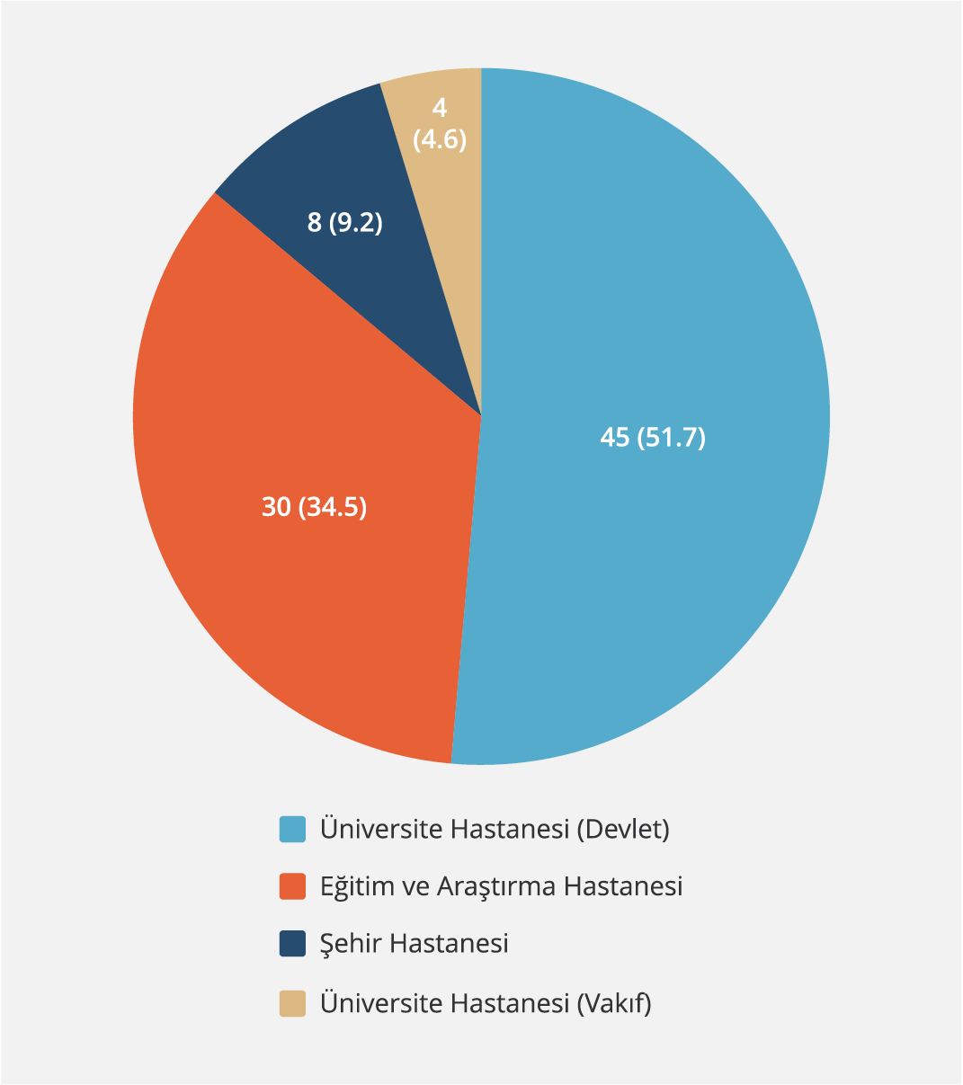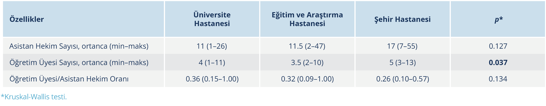 Türkiye’de eğitim kliniklerinin dağılımında devlet üniversitesi hastaneleri ilk sırada yer alırken, bunu eğitim ve araştırma hastaneleri, şehir hastaneleri ve vakıf üniversitesi hastaneleri izledi (Şekil 2). Öğretim üyelerinin %5.7’si (22/388) vakıf üniversitelerinde, %34.3’ü (133/388) ise devlet üniversitelerinde görev yapmakta idi. Eğitim kliniklerinde bulunan öğretim üyesi sayısının ortanca değeri 6 (1–13), asistan hekim sayısının ortanca değeri ise 11 (1–55) olarak saptandı. Eğitim kliniklerinin %40’ında (35/87) öğretim üyesi/asistan hekim oranı 1:3’ün altındaydı. Hastane türlerine göre öğretim üyesi/asistan hekim oranı (p=0.134) ve asistan hekim sayısı (p=0.127) açısından istatistiksel olarak anlamlı düzeyde bir farklılık görülmezken, öğretim üyesi sayısı açısından şehir hastaneleri lehine istatistiksel olarak anlamlı bir farklılık saptandı (p=0.037) (Tablo 2).