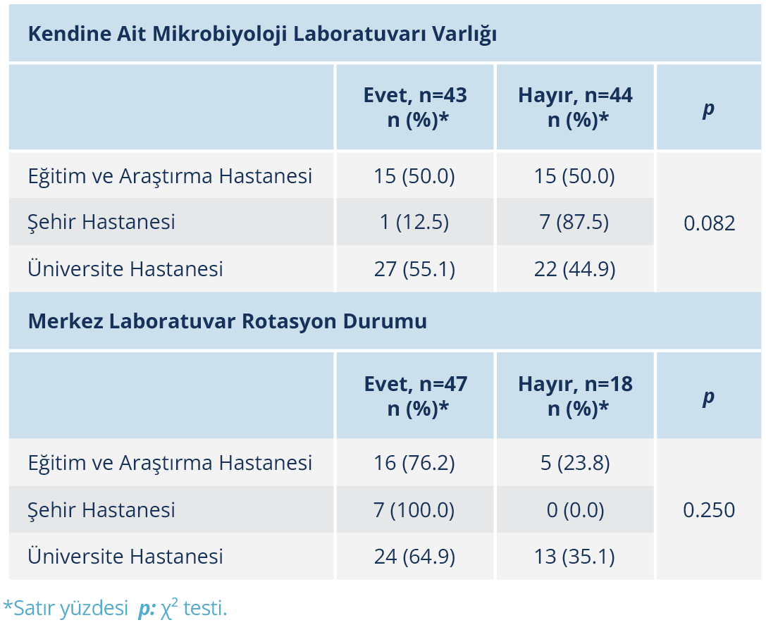 rotasyona gitmekte idi. Eğitim kliniklerinde mikrobiyoloji laboratuvarı varlığı (p=0.082) ve merkez mikrobiyoloji laboratuvarında rotasyona gitme durumu (p=0.250) hastane türlerine göre istatistiksel olarak anlamlı düzeyde bir farklılık göstermedi (Tablo 4).