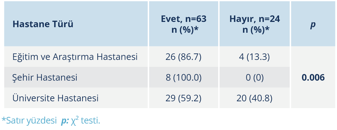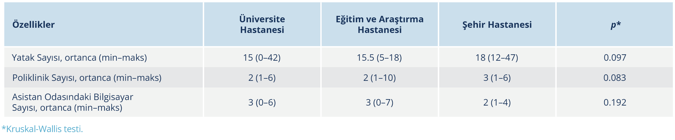 Serviste görev yapan asistan hekim sayısının ortanca değeri 3 (0–12) olarak belirlendi. Kliniklerin %82’sinde (71/87) gündüz çalışma odası, %67’sinde (58/87) dinlenme odası bulunduğu bildirildi. Nöbetlerde ayrı bir dinlenme odasına sahip kliniklerin oranı %22 (19/87) idi. Ayrıca, kliniklerin %53’ünde (46/87) bilgisayar sayısı asistan sayısından az olarak bildirildi. Eğitim kliniklerinin çalışma ortamına ilişkin değişkenler arasında yatak sayısı (p=0.097), poliklinik sayısı (p=0.083) ve asistan odalarındaki bilgisayar sayısı (p=0.192) açısından hastane türleri arasında istatistiksel olarak anlamlı düzeyde bir fark tespit edilmedi (Tablo 3).
